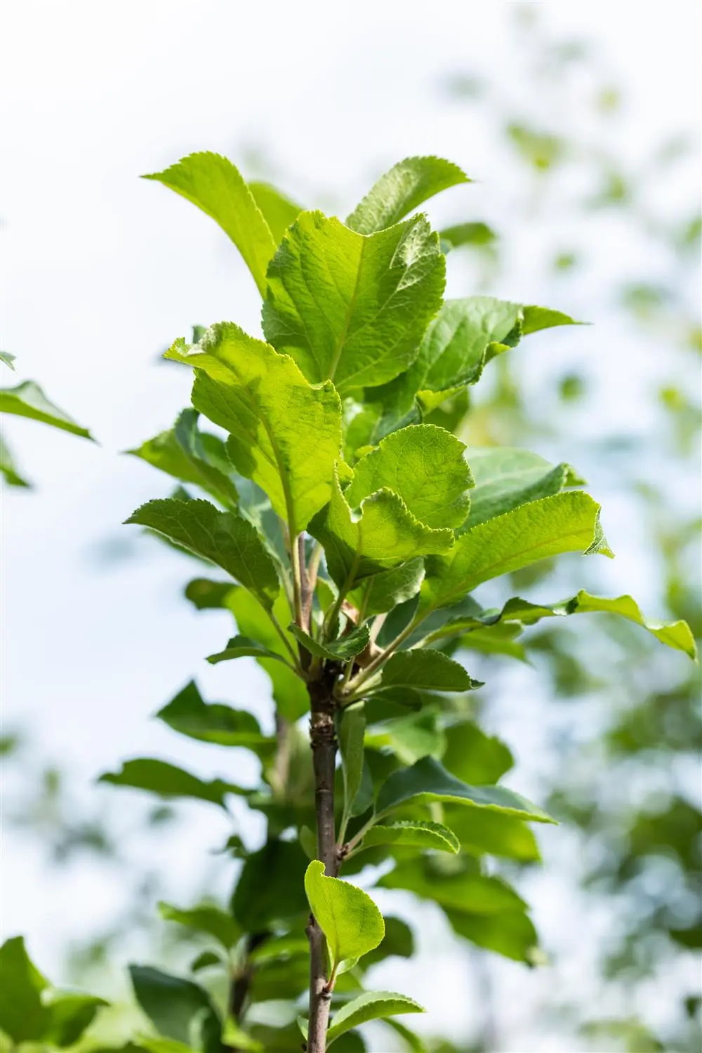 The deciduous leaves of the Apple 'James Grieve' are medium green, ovate, serrated.