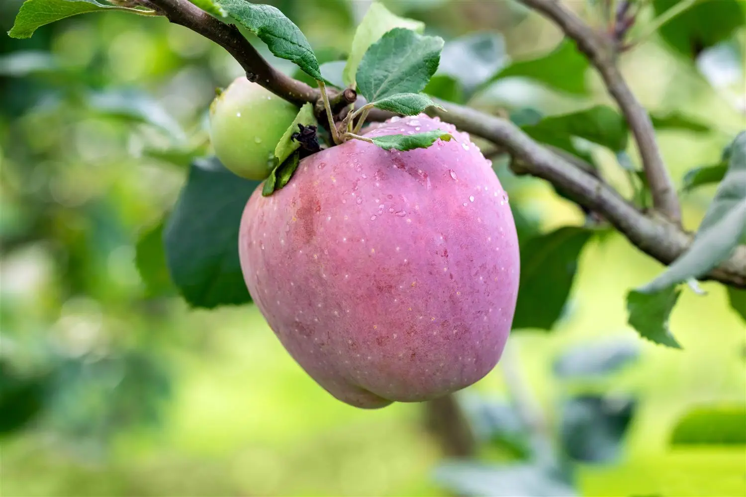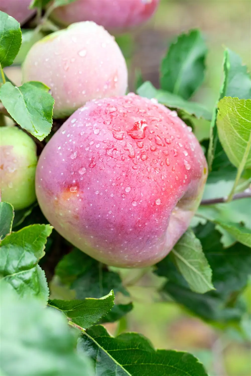 The Apple 'Florina' (Malus domestica) produces green-red, firm fruits. They have a sweet flavour. Well-drained, nutrient-rich soil and a sunny to semi-shady location create ideal conditions for a high-yielding harvest from October. Its light pink flowers are a beautiful sight. With its upright and broad growth, the Apple 'Florina' grows to around 4.5 m high and 3 m wide.