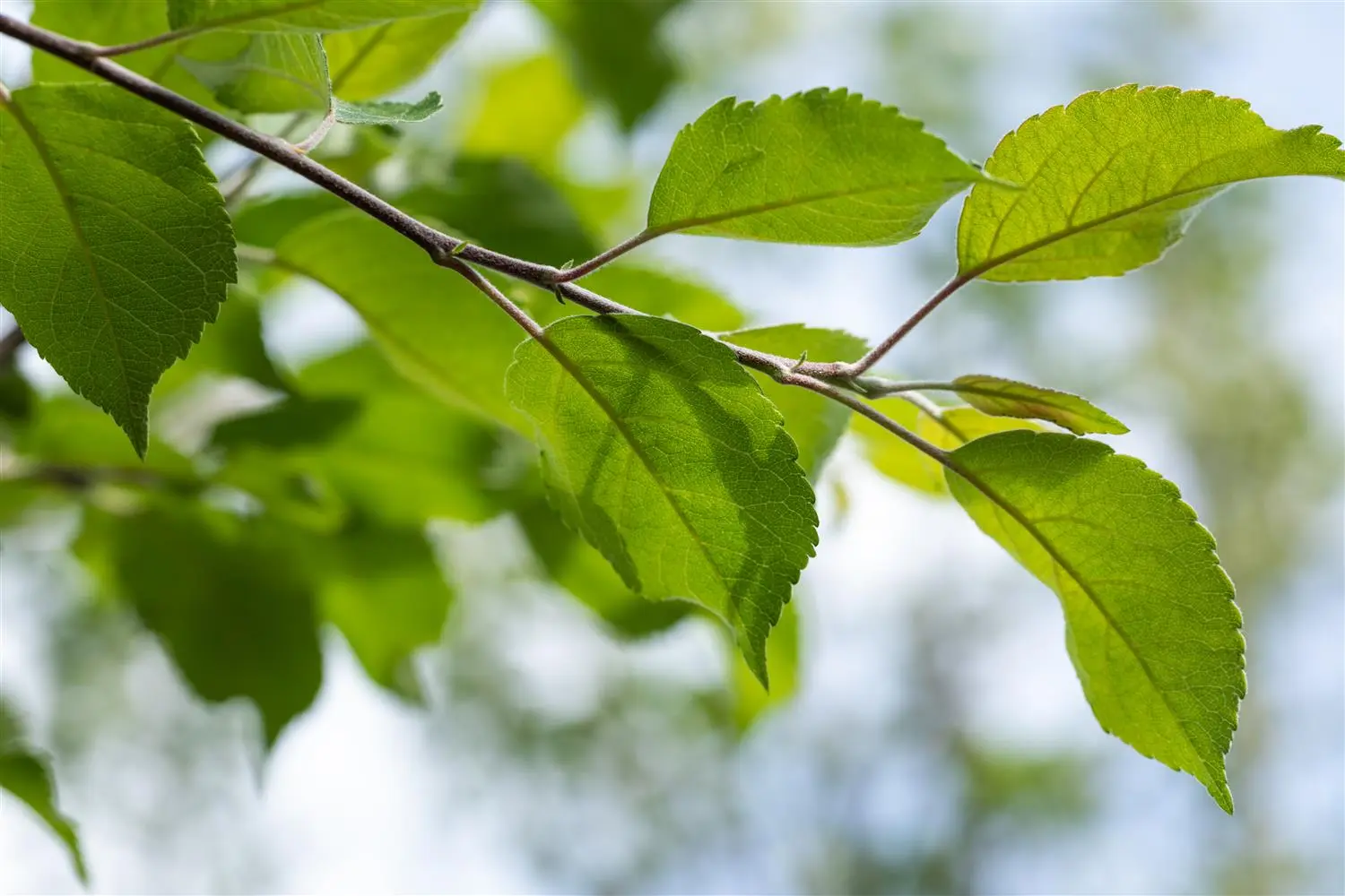 The deciduous leaves of the Apple 'Florina's are medium green, ovate, serrated.