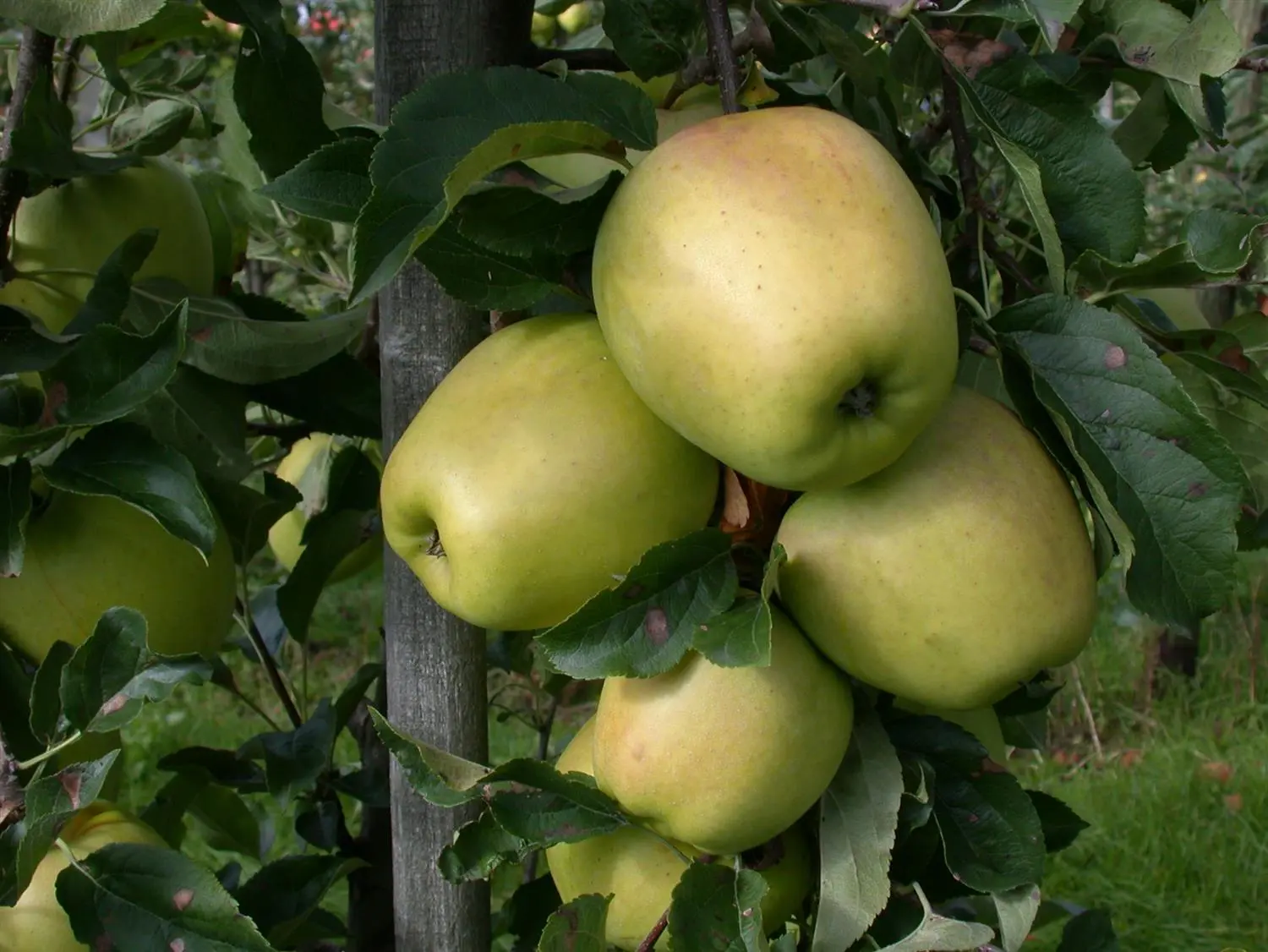 Malus domestica 'Glockenapfel' forms yellow-green, elongated fruits.