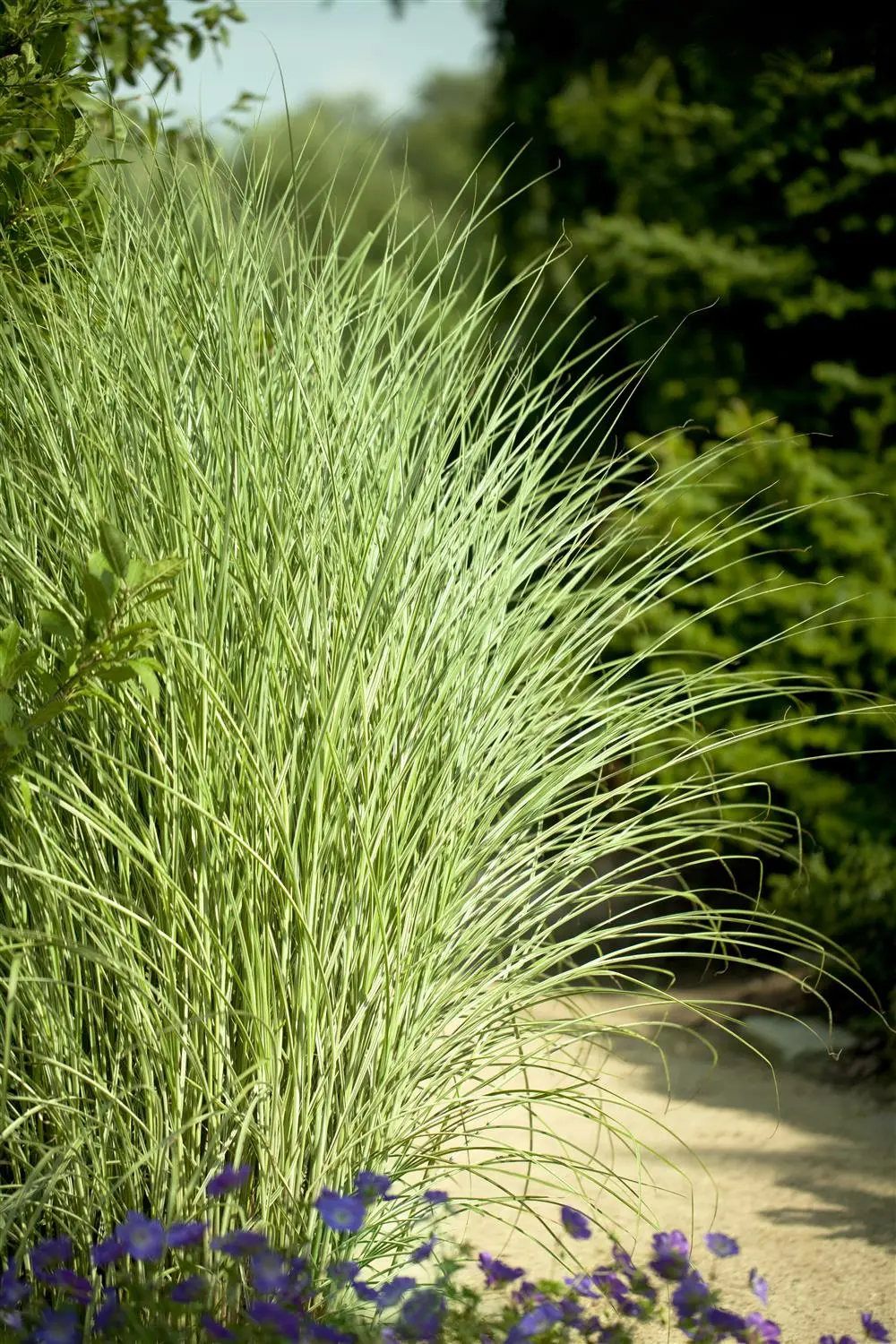 With its green and white leaf colouring, Eulalia 'Morning Light' (Miscanthus sinensis) is a decorative design element in the garden, which also stands out with its upright and clump-forming growth. The silvery panicles of flowers adorn this grass from autumn onwards. It feels most at home in a sunny to semi-shady location with a well-drained, humus-rich, nutrient-rich soil. In favourable conditions, this hardy grass reaches a height of approx. 1.2 m and grows up to 80 cm wide.