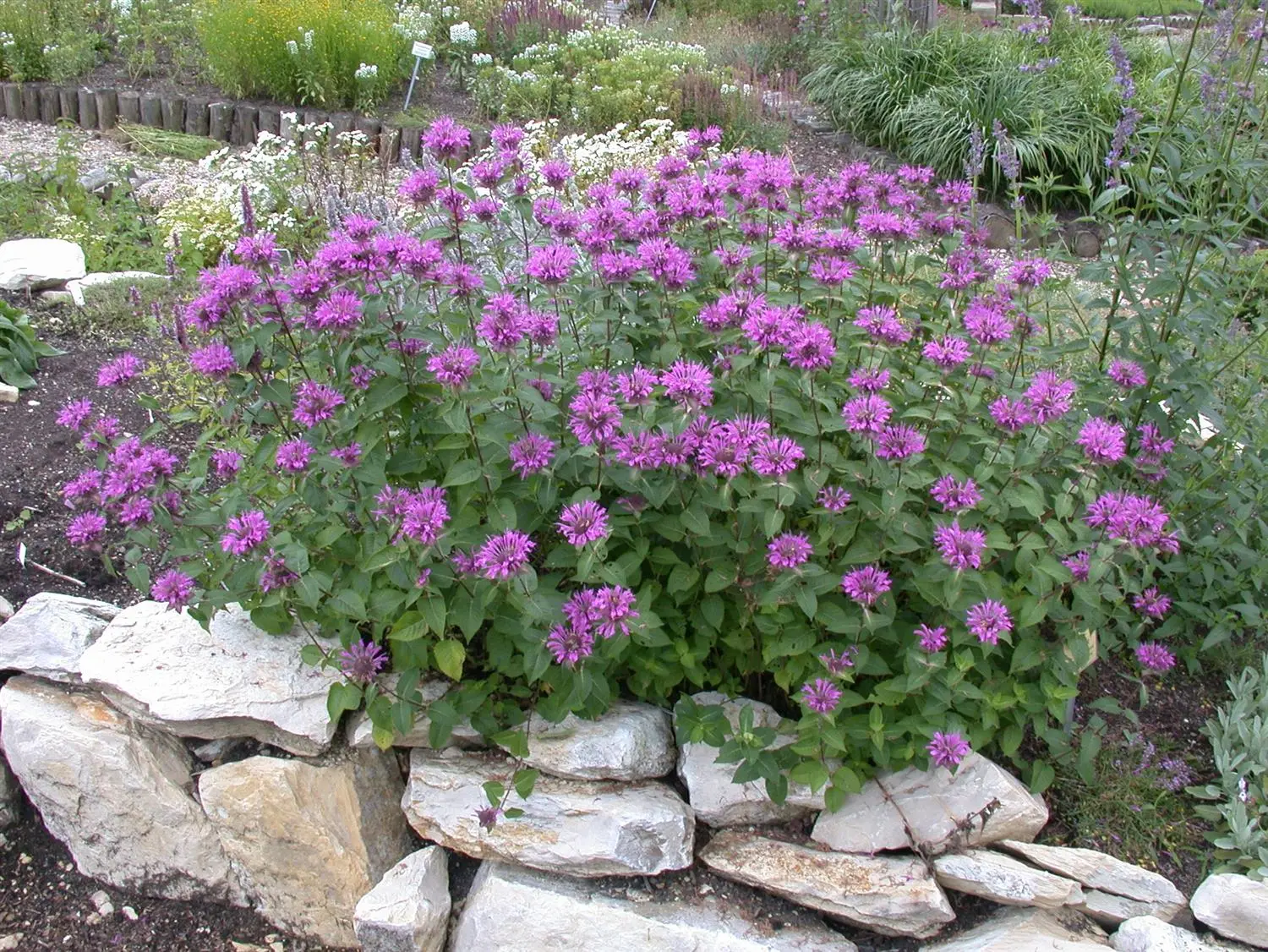The Wild bergamot (Monarda fistulosa) is an upright, branched perennial that forms purple, lip-shaped flowers arranged in whorls from July to September. Its lanceolate leaves are dark green. In a sunny location with well-drained, nutrient-rich soil, it usually reaches a height of approx. 1.2 m and grows to a width of approx. 60 cm. The Wild bergamot is well tolerant of frost.