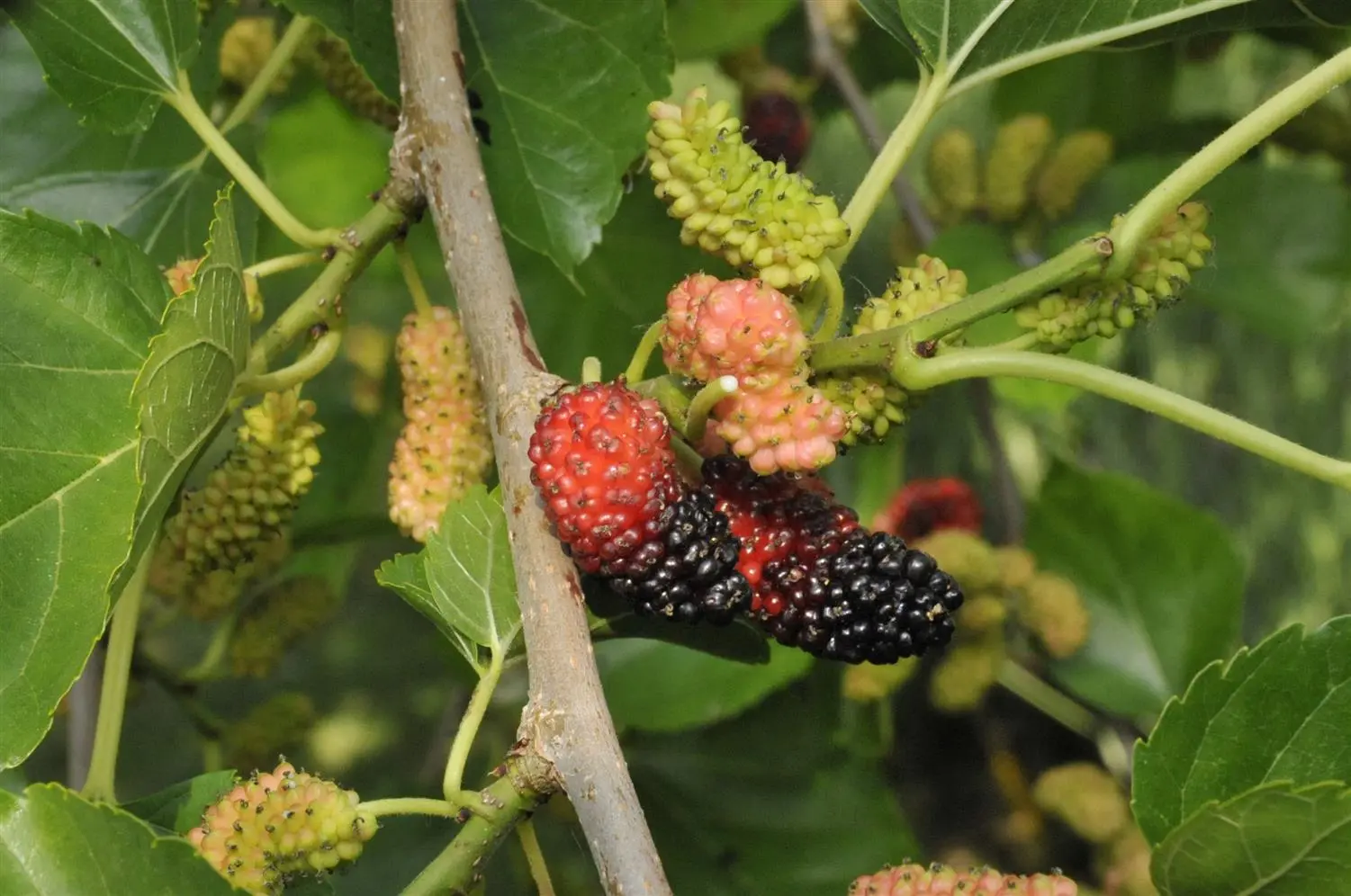 Morus nigra forms inconspicuous flowers arranged in spikes from May.