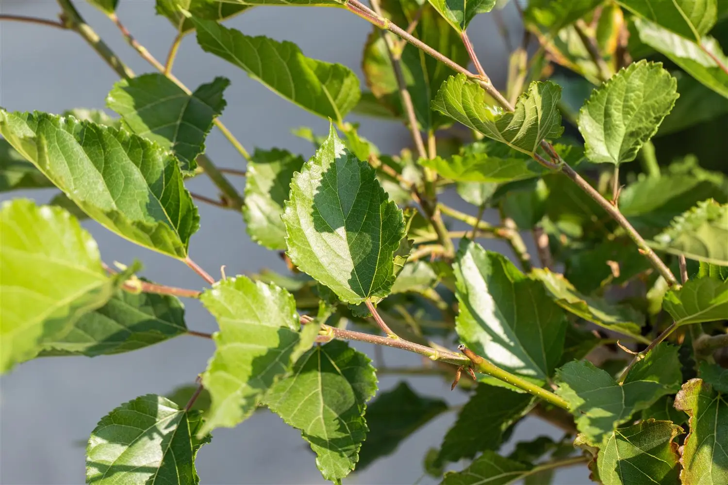 The deciduous leaves of Mulberry 'MojoBerry' are medium green, ovate, serrated.