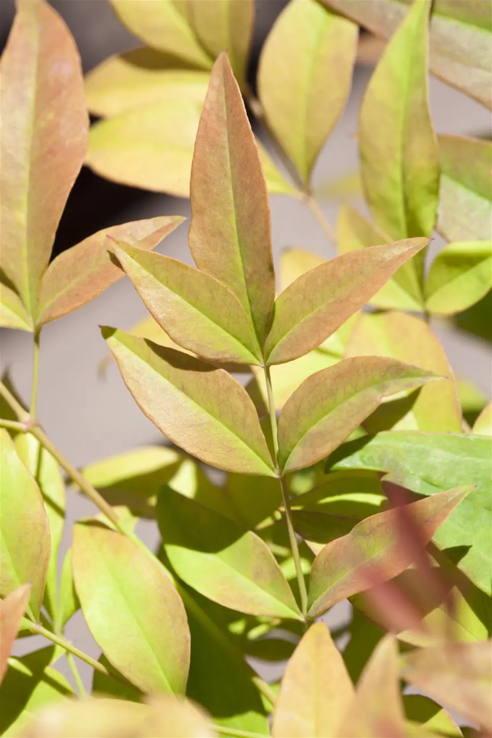 The evergreen leaves of Heavenly bamboo are green-red, lanceolate. Heavenly bamboo turns bright purple-red in autumn.