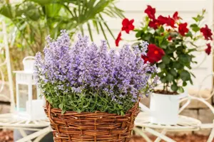 The Garden catmint 'Six Hills Giant' (Nepeta x faassenii) is a bushy perennial that forms clumps and produces lilac-coloured, lip-shaped flowers from July to September. Its heart-shaped, notched leaves are grey-green. In a sunny location with well-drained, sandy, dry soil, it usually reaches a height of approx. 50 cm and is approx. 40 cm wide. The Garden catmint 'Six Hills Giant' is well tolerant of frost.