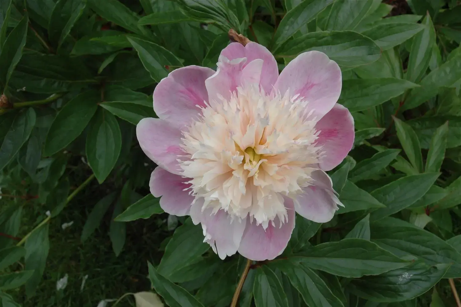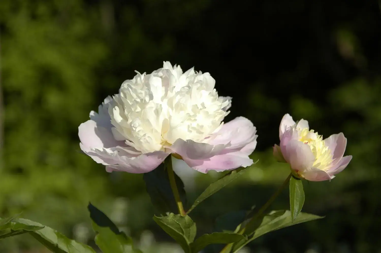 Paeonia lactiflora 'Bowl of Beauty' forms semi-double, cupped, creamy white-pink flowers from May. These exude a pleasant fragrance.