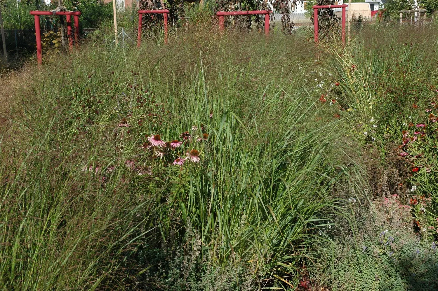 The pink-red flowers of Switch grass 'Squaw' appear in panicles from July to September.