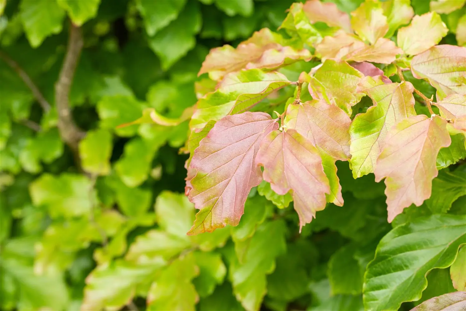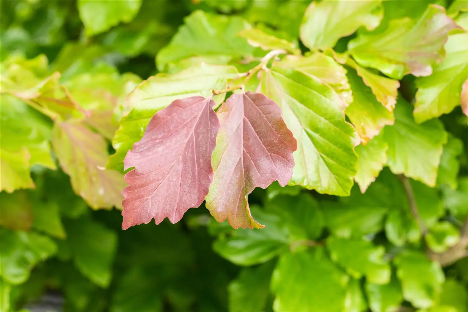 The deciduous leaves of the Persian ironwood 'Felicie's are medium green, roundish, leathery, alternate. They are about 8 - 10 cm tall. Green-red shoots. Persian ironwood 'Felicie' turns a bright dark red in autumn.