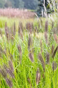 With its medium green leaf colouring, Fountain grass 'Red Head' (Pennisetum alopecuroides) is a decorative design element in the garden, but with its bushy growth it also adorns containers on balconies or terraces. The red panicles of flowers adorn this grass from summer onwards. It feels most at home in a sunny location with well-drained, nutrient-rich soil. In favourable conditions, this hardy grass reaches a height of approx. 60 cm and grows up to 80 cm wide.