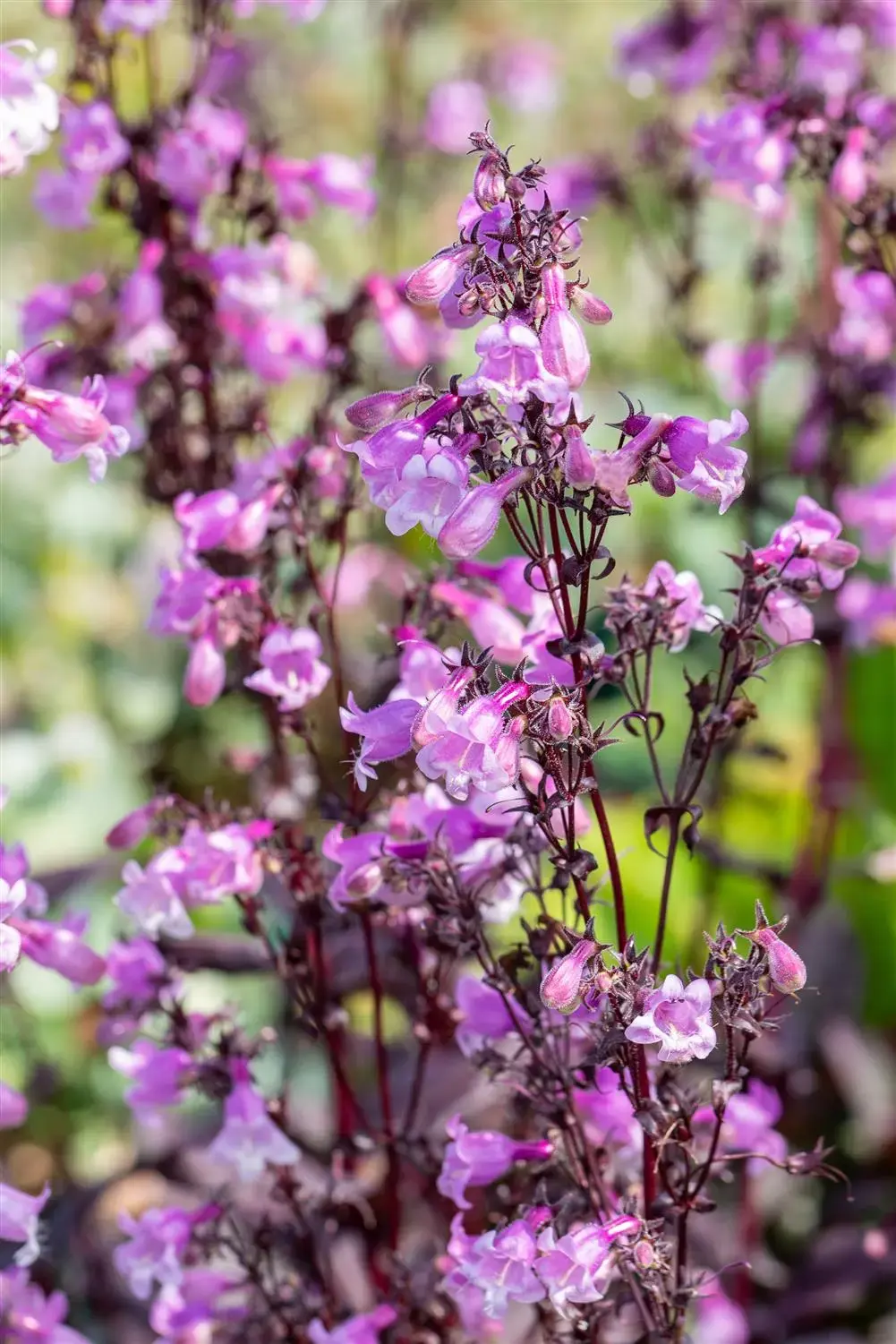 Penstemon digitalis 'Midnight Masquerade' forms tubular, lilac-coloured flowers arranged in panicles from July.