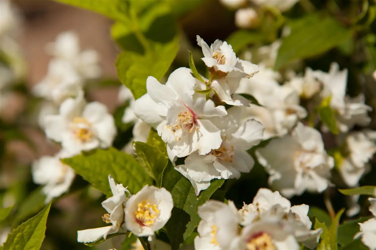 The Mock orange (Philadelphus) is an upright garden plant that produces white flowers.