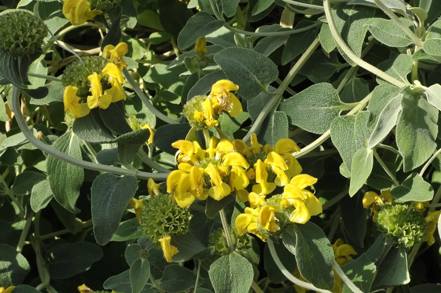 Phlomis fruticosa forms lip-shaped, yellow flowers arranged in whorls from June.