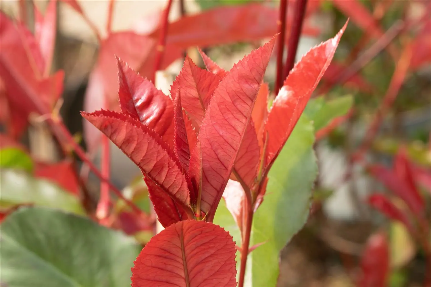 The Christmas berry 'Red Select' (Photinia fraseri) is a shrub-like garden plant that produces white flowers. They appear from April to May. The Christmas berry 'Red Select' also has shiny, lanceolate, dark green leaves. The copper-brown shoots are also an interesting sight. In a sunny to semi-shady location with well-drained, weakly acidic soil, it usually reaches a height of around 6 metres and grows to around 6 metres wide.