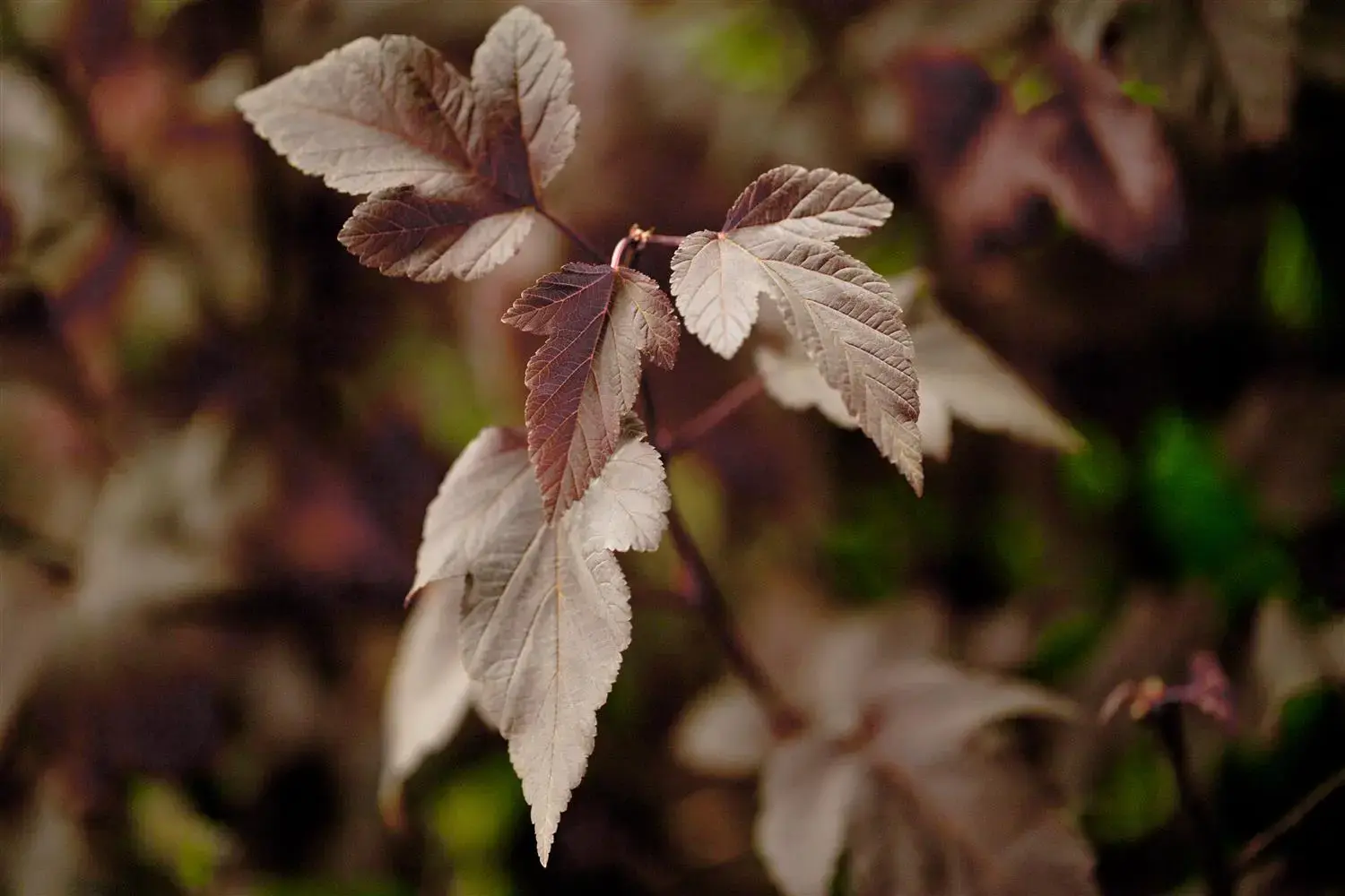 The shoots of Physocarpus opulifolius 'Red Baron' are light brown in colour.