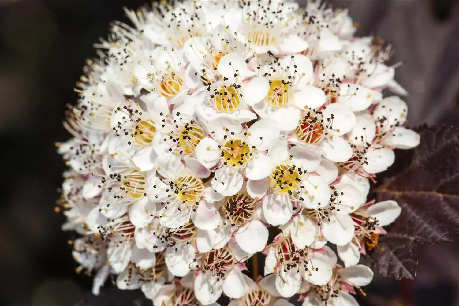 The Ninebark 'Summer Wine'® (Physocarpus opulifolius) is a bushy, upright, deciduous small shrub with decorative, egg-shaped, dark red leaves. It also bears white flowers arranged in umbels from June to July. These produce red fruits from September. In a sunny to semi-shady location with well-drained soil, it usually grows to a height of around 1.5 metres and is around 2 metres wide.