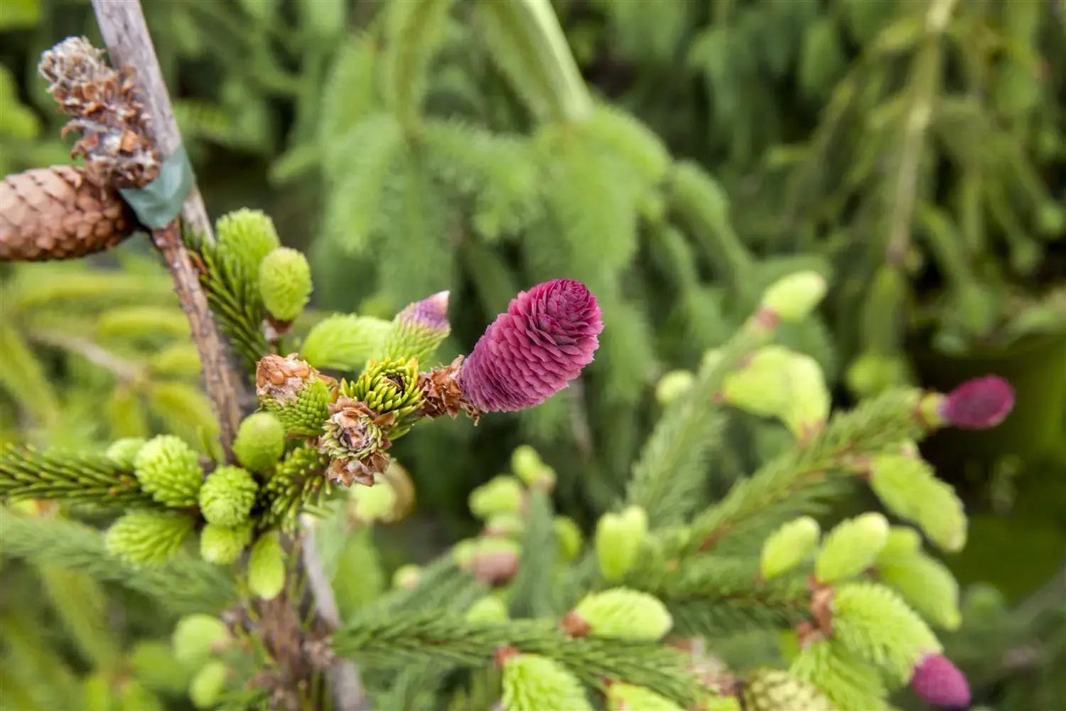 The brown cones of Picea abies 'Acrocona' are very large and oval and appear from September. The young cones have a purple-red colour.