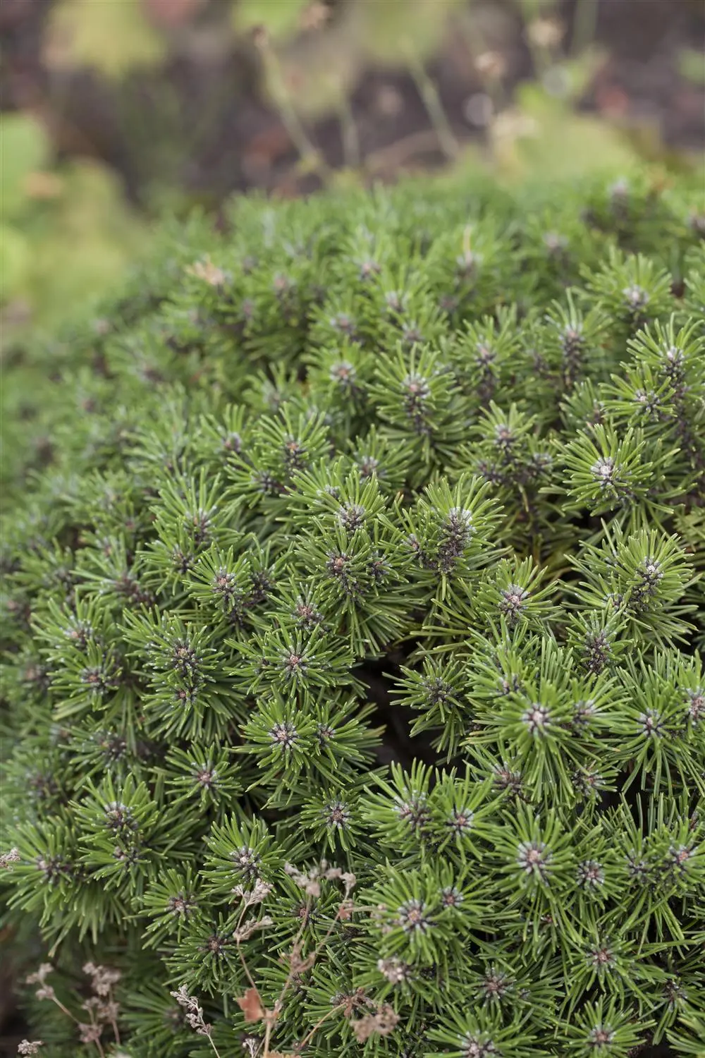 The conical, brown-yellow cones of Pinus mugo 'Benjamin' appear from October. The young cones have a pinkish-red colour.