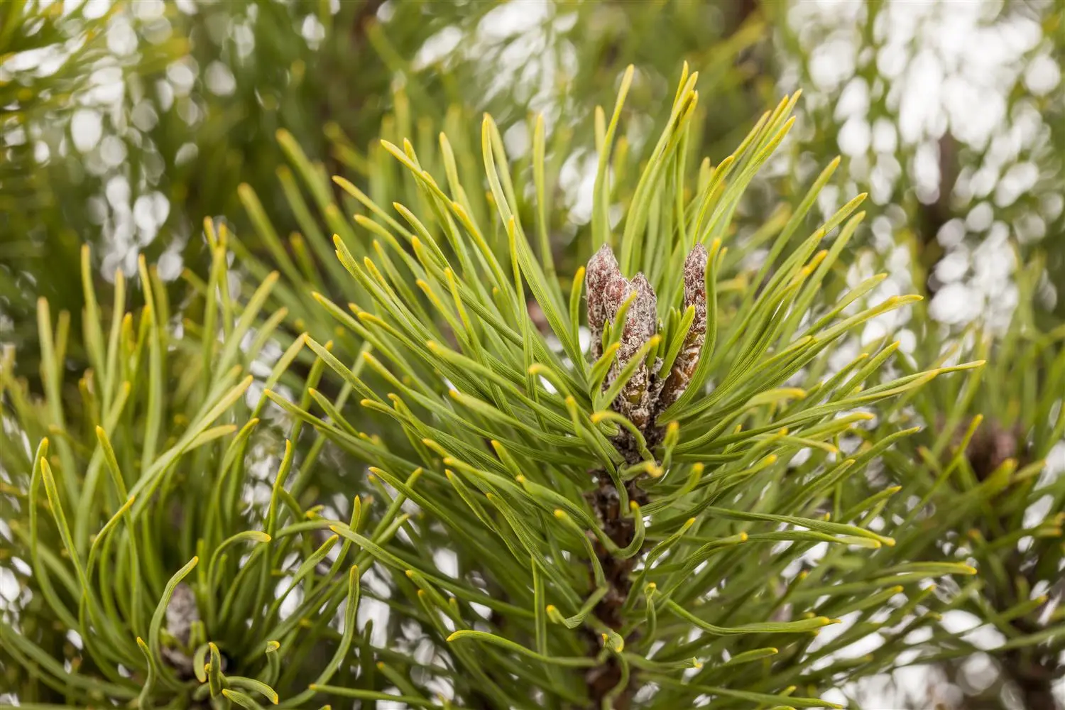 The Dwarf mountain pine (Pinus mugo) is a shrub that grows bushy and sprawling and usually reaches a height of around 4 metres and a width of around 4 metres. Its needle-shaped leaves have a medium green colour. Decorative brown-yellow cones adorn Pinus mugo subsp. mughus from October. This shrub tolerates frost well. It prefers a sunny location. The Dwarf mountain pine makes no special demands on the soil.