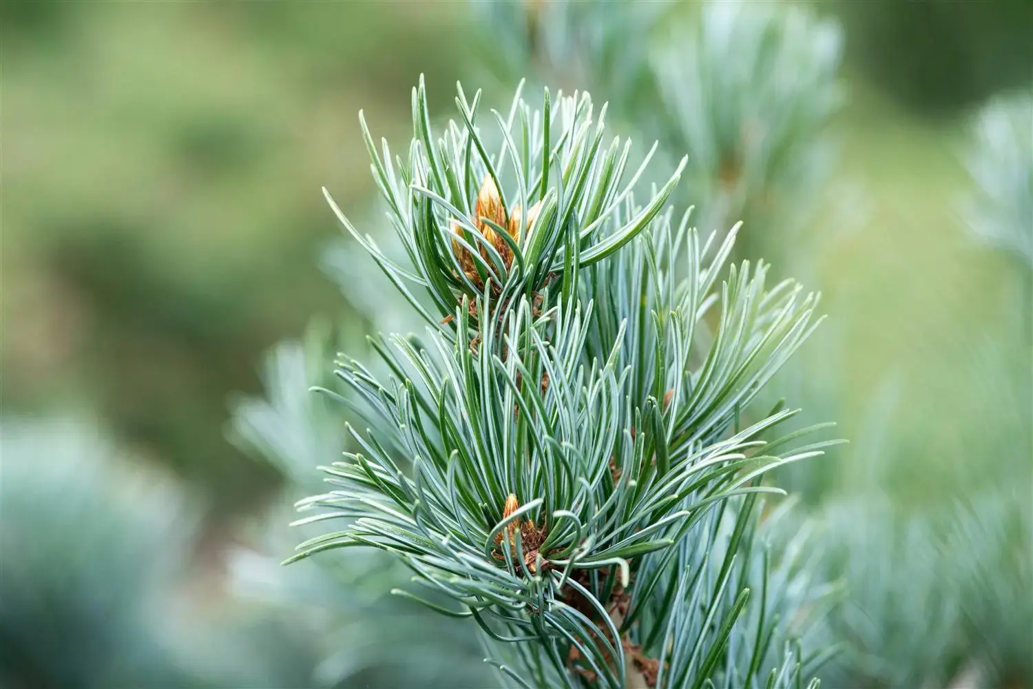 The Japanese white pine 'Saphir' (Pinus parviflora) is a woody plant that grows upright and usually reaches a height of around 3 metres. Its needle-shaped leaves are blue-green in colour. This shrub is well tolerant of frost and prefers well-drained, calcareous, slightly acidic soil in a sunny position.