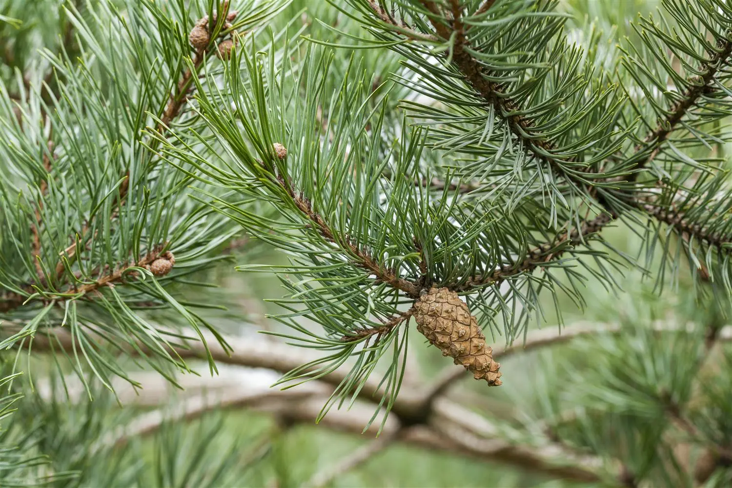 The brown cones of Pinus sylvestris are small and cone-shaped.