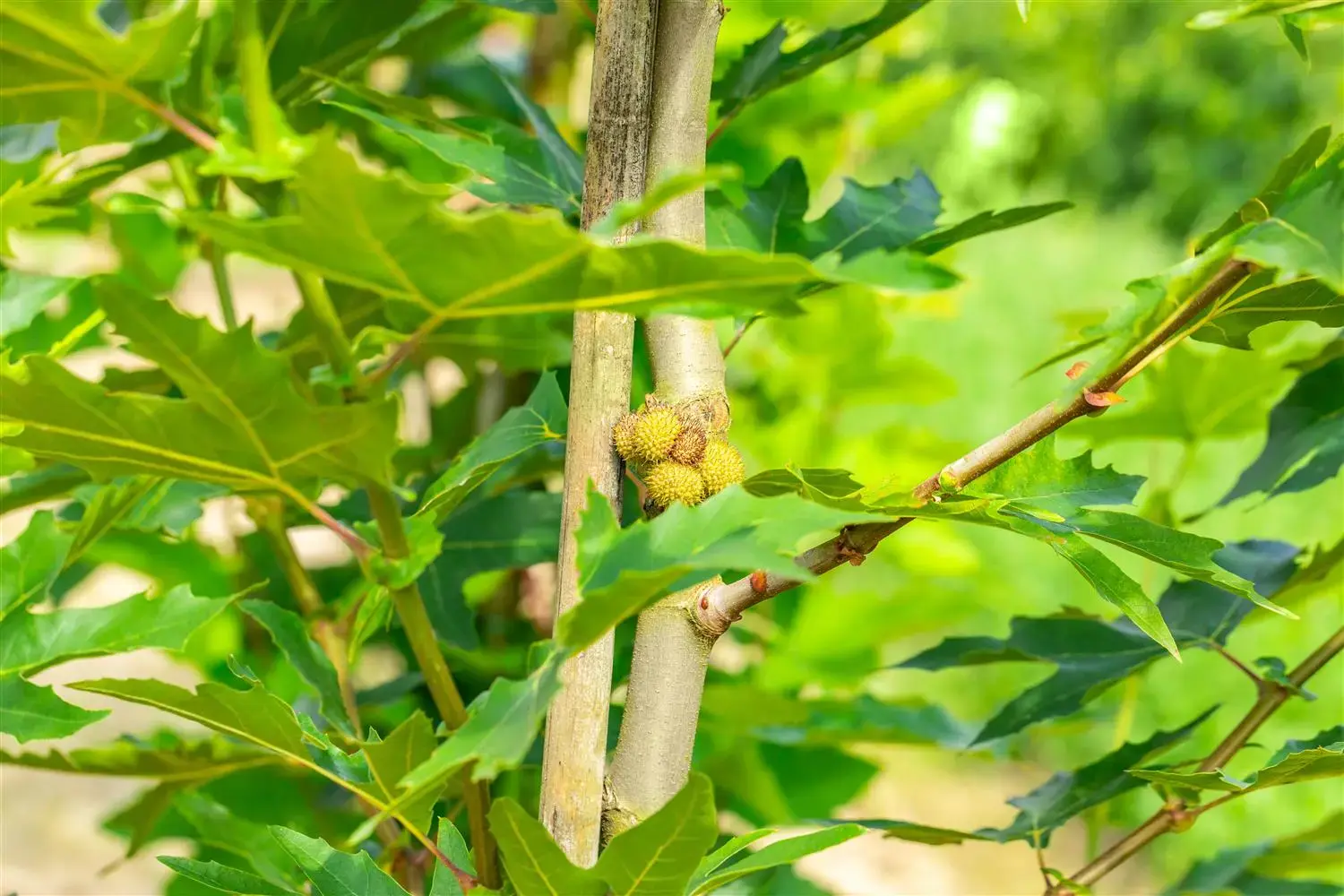 The brown, round fruits of Platanus orientalis 'Minaret' are particularly decorative.