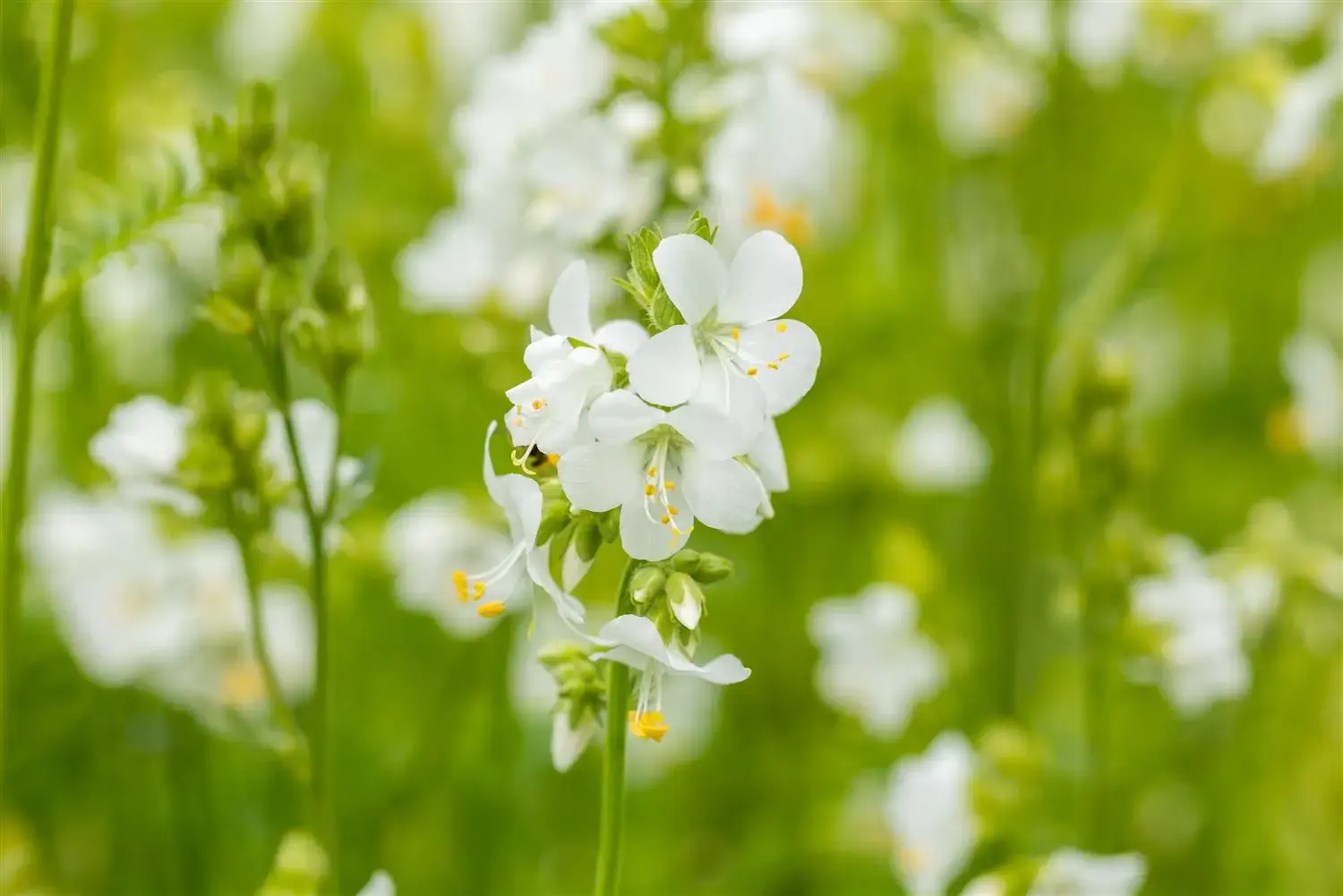 Polemonium caeruleum 'Album' forms funnel-shaped, white flowers from May. These exude a pleasant fragrance. With the right care, re-flowering from July to August.