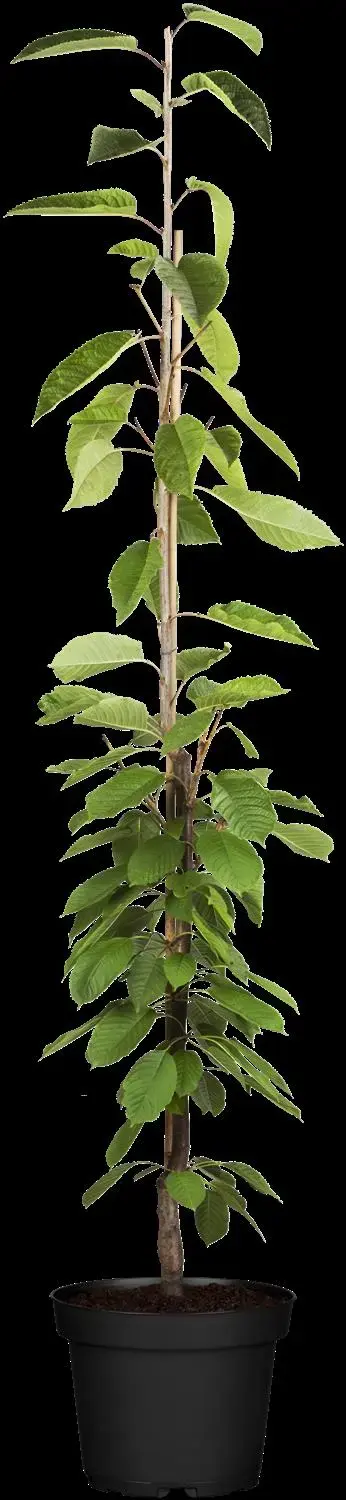 The Wild cherry 'Sylvia'® (Prunus avium) produces dark red, large, medium-firm fruits. They have a sweet, aromatic flavour. Well-drained, calcareous, nutrient-rich soil and a sunny to semi-shady location create the ideal conditions for a high-yielding harvest from the end of June. Its white, pleasantly fragrant flowers are a beautiful sight. With its columnar growth, the Wild cherry 'Sylvia'® grows to around 3 metres high and 40 cm wide, making it ideal for growing in pots on balconies or terraces.