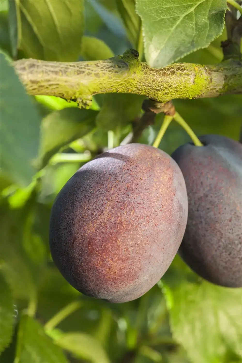 The Plum 'Jubiläum' (Prunus domestica) produces purple-violet, large, soft fruits. They are oval and have a sweet and sour, juicy flavour. Well-drained, humus-rich soil and a sunny to semi-shady location create the ideal conditions for a high-yielding harvest from August. Its white flowers are a beautiful sight. The Plum 'Jubiläum' grows to around 10 metres high and 6 metres wide.