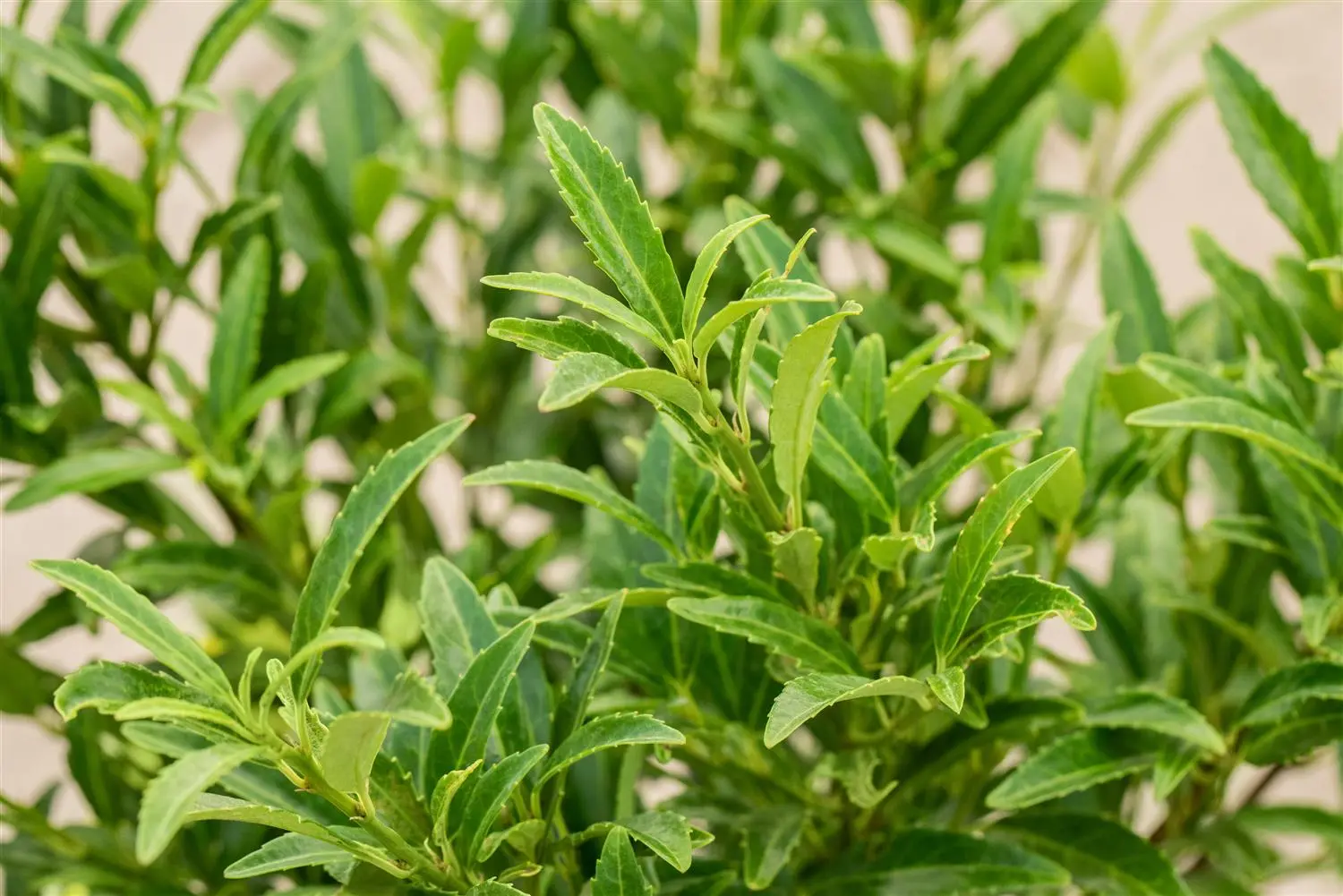 High leaf ornamental value. The evergreen leaves of the Cherry laurel 'Sofia'® are medium green, lanceolate, glossy, alternate, serrated.