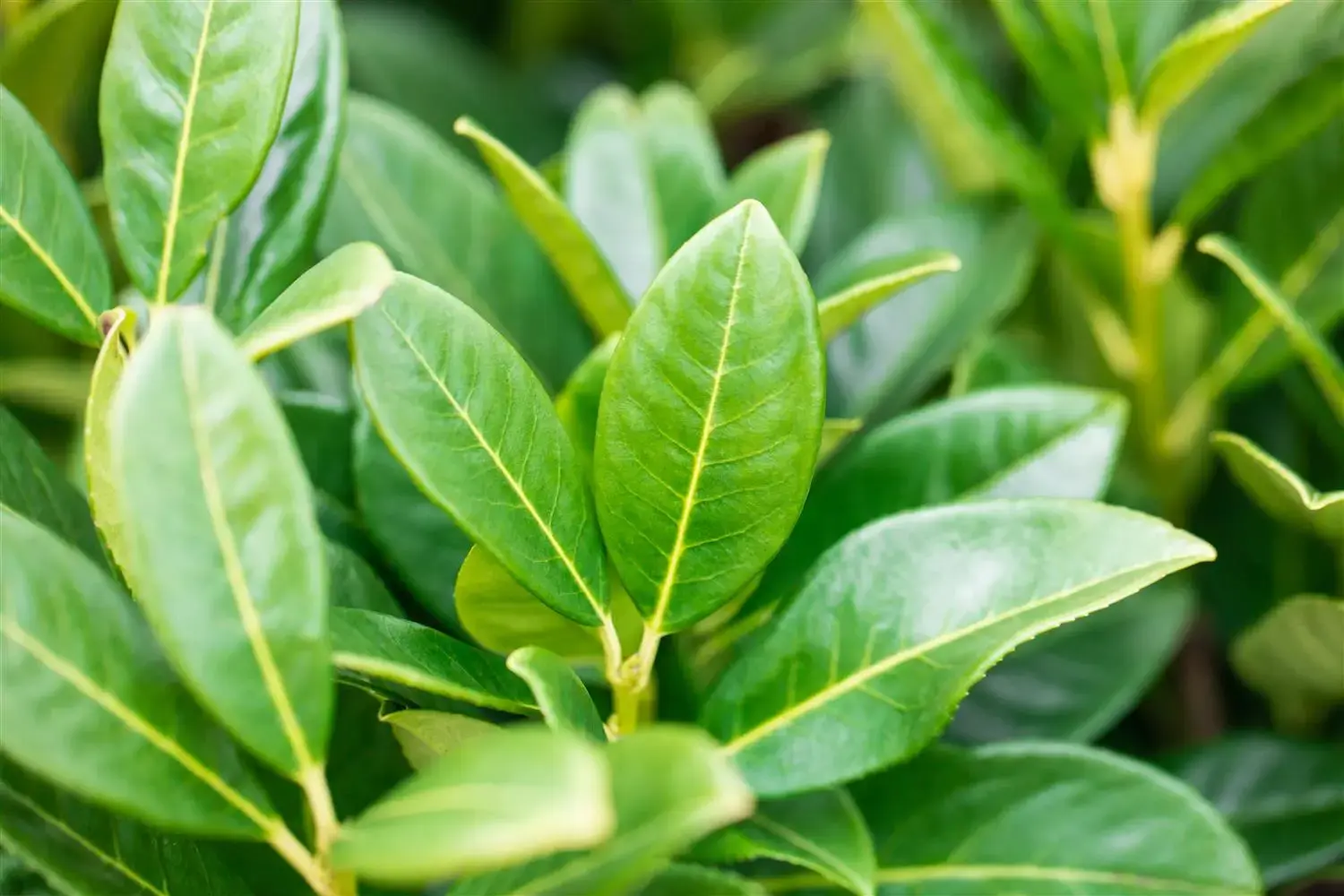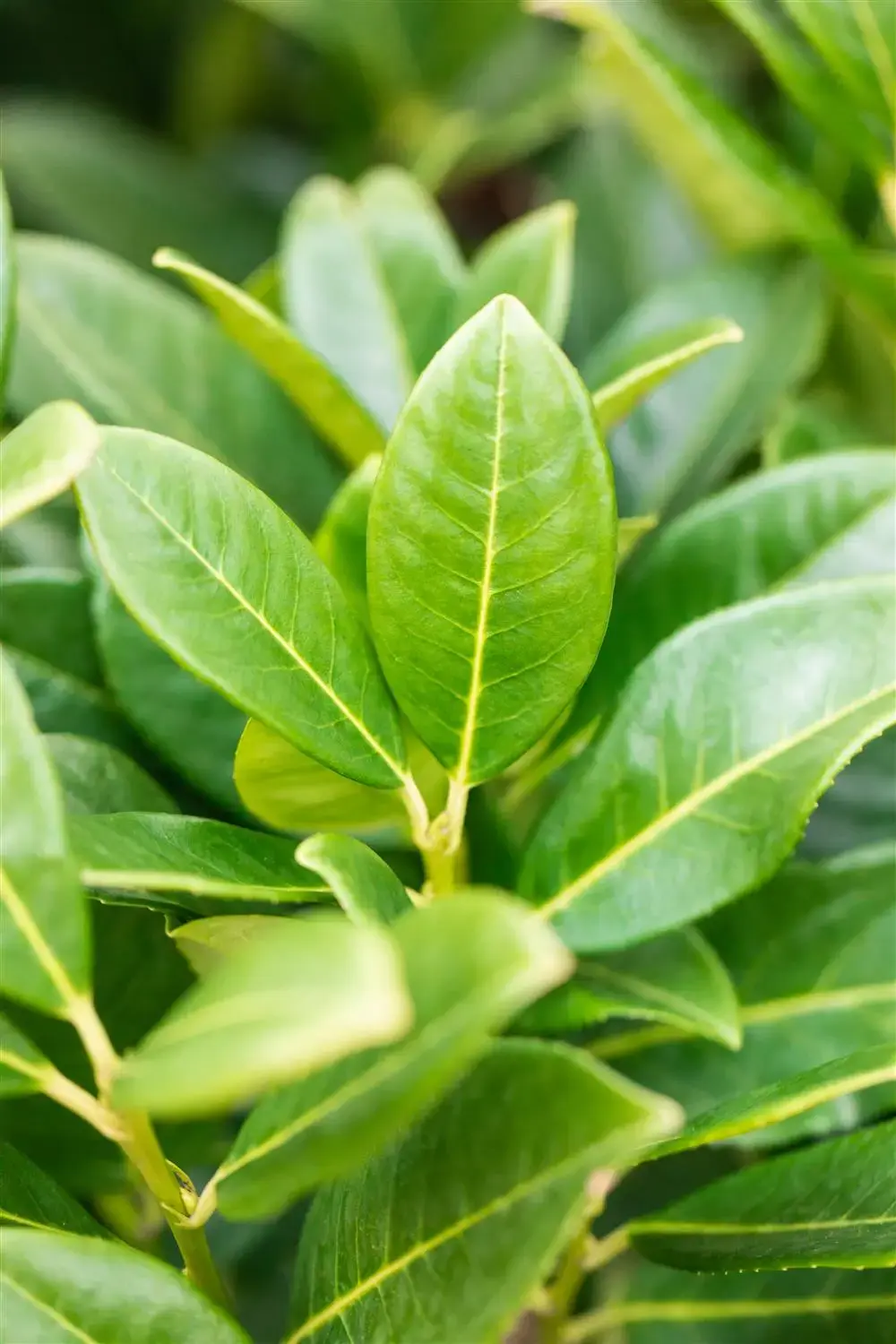 The evergreen leaves of the Cherry laurel 'Greentorch' are dark green, ovate, glossy, alternate.