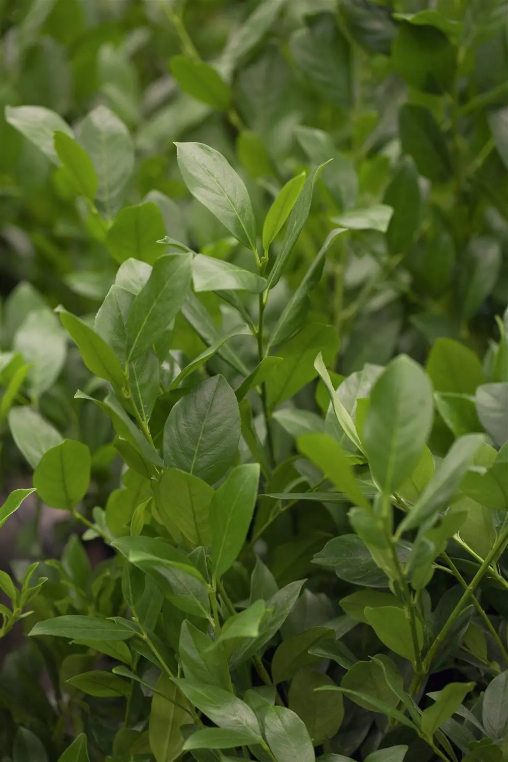 The evergreen leaves of the Cherry laurel 'Mano' are dark green, ovate, glossy, alternate.