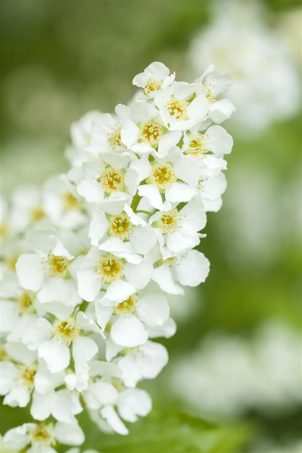 The Bird cherry (Prunus padus) is a sprawling, multi-stemmed large shrub with decorative, black, round fruits. These exude a strong fragrance. It produces white flowers arranged in clusters from April to May. The Bird cherry also has matt, egg-shaped, medium-green leaves. In a sunny to semi-shady location, it usually reaches a height of around 10 metres and grows to a width of around 8 metres. The Bird cherry makes no particular demands on the soil.