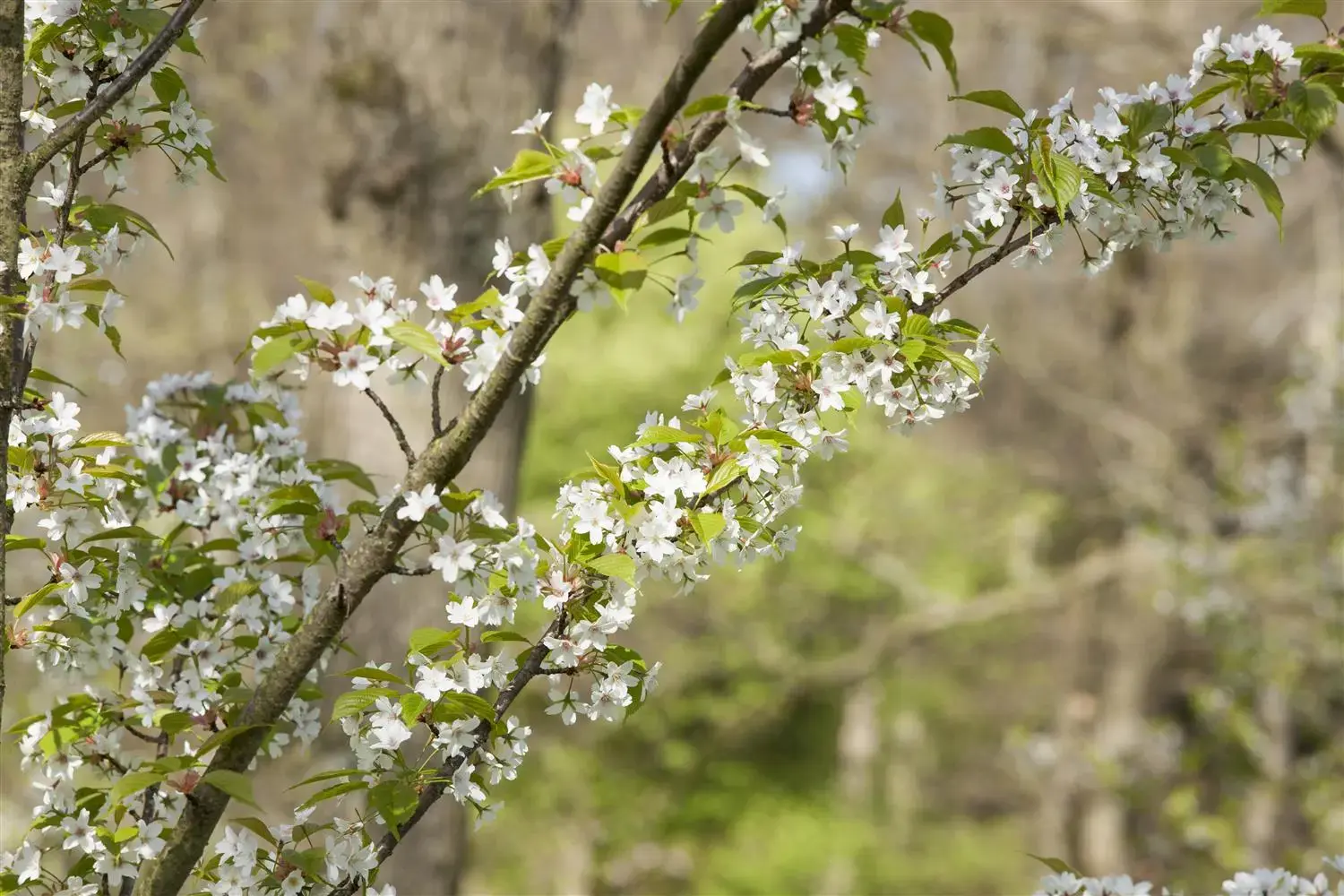 The Japanese cherry 'Tai-Haku' (Prunus serrulata) is an upright, vigorous large shrub with decorative fruits. It produces white, cup-shaped flowers from April to May. The Japanese cherry 'Tai-Haku' also has lanceolate, dark green leaves. The copper-brown shoots are also an interesting sight. In a sunny location with well-drained, sandy, loamy soil, it usually reaches a height of around 6 metres and grows to a width of around 5 metres.