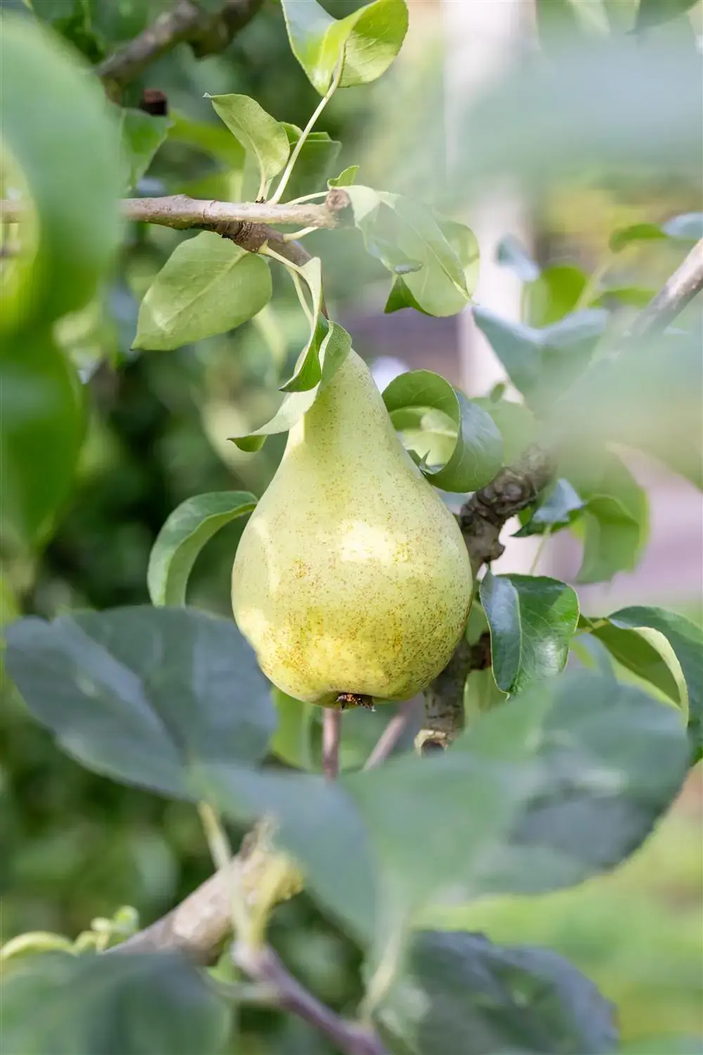 The Common pear 'Concorde'(s) (Pyrus communis) produces yellow-green, medium-sized, juicy and crunchy fruits. They are elongated and have a sweet, mild flavour. Loose, loamy soil and a sunny to semi-shady location create ideal conditions for a high-yielding harvest from September. Its white flowers are a beautiful sight. With its conical and upright growth, the Common pear 'Concorde'(s) grows to around 3.5 m high and 1 m wide.
