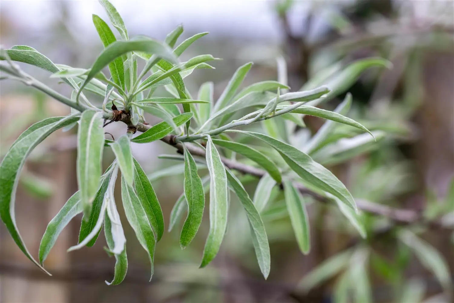 The deciduous leaves of Willow-leaved pear are silver-grey, lanceolate, matt, alternate. They are about 6 - 9 cm long. Long adherent.