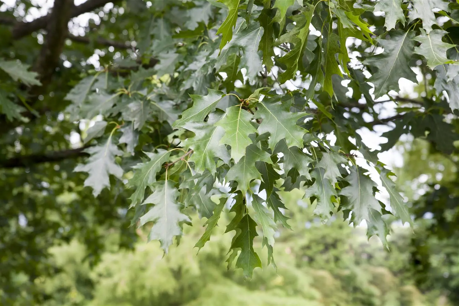 The Red oak (Quercus rubra) is a sprawling, roundish large tree with decorative, brown, oval fruits. It produces inconspicuous flowers in May. The Red oak also has egg-shaped, dark green leaves. In a sunny location with well-drained, sandy, loamy soil, it usually reaches a height of around 25 metres and grows to a width of around 18 metres.