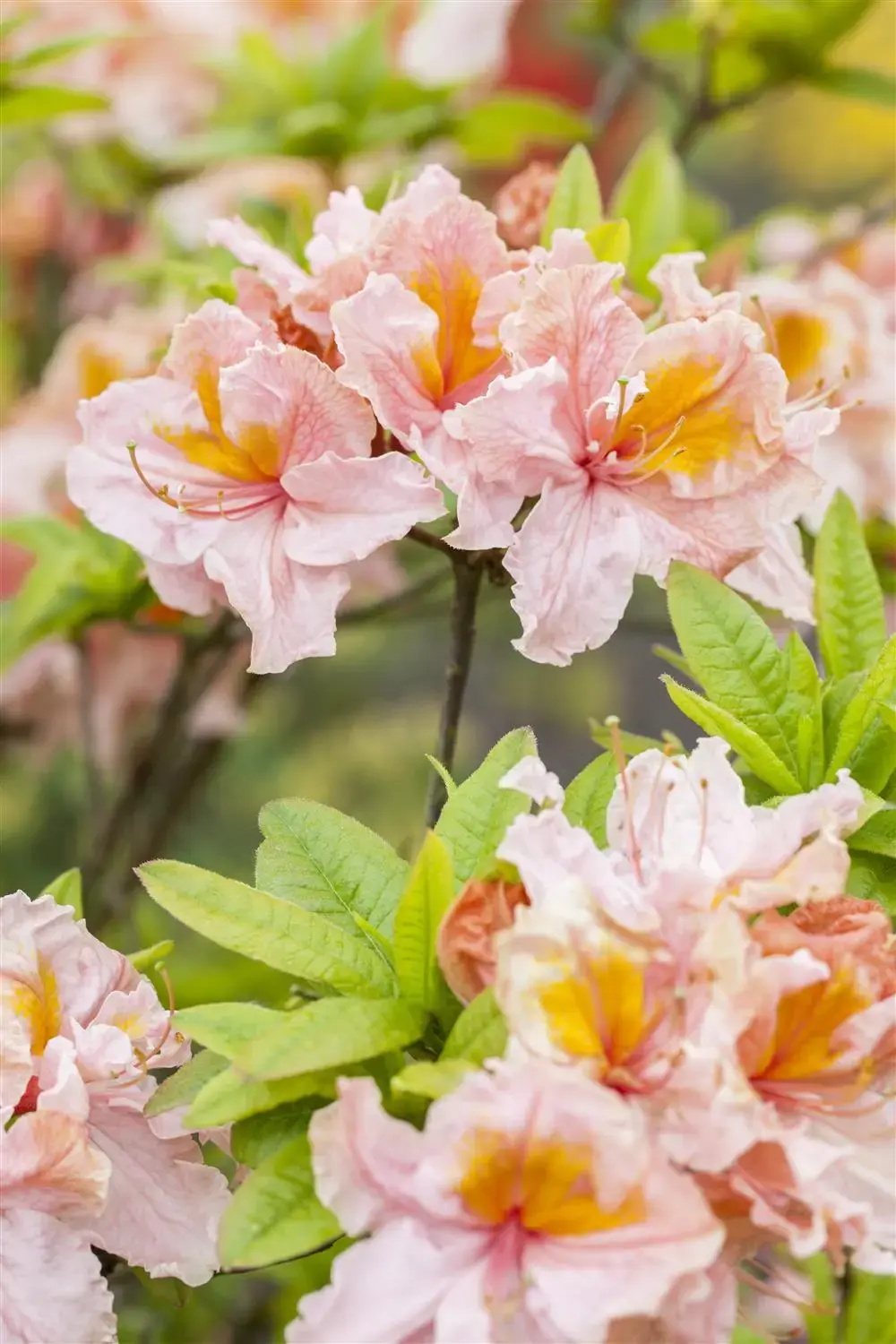 The Yellow azalea 'Berryrose' (Rhododendron luteum) produces a veritable sea of salmon-pink flowers with yellow markings from the end of May to mid-June. Its deciduous foliage is medium green. In autumn, the foliage turns dark red. This upright, branching shrub usually reaches a height of 2 - 3 metres and a width of 2 to 3 metres. A semi-shady (to shady) location and a humus-rich, lime-free soil create optimum conditions for healthy growth. The Yellow azalea 'Berryrose' is well tolerant of frost.