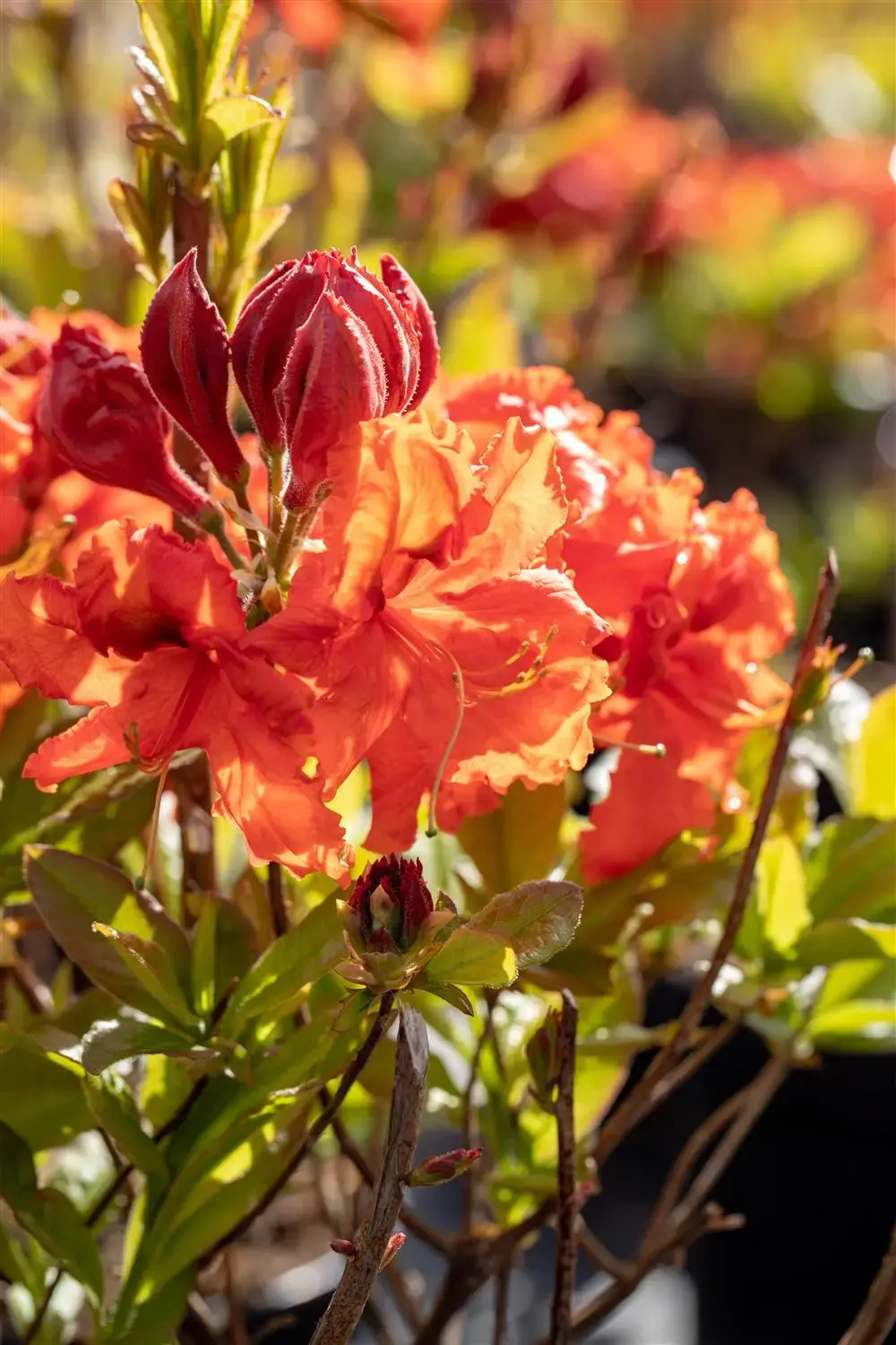 The Yellow azalea 'Gibraltar' (Rhododendron luteum) produces a veritable sea of copper-orange flowers from the end of May to mid-June. Its deciduous foliage is medium green. In autumn, the foliage turns purple-red. This compact growing shrub usually reaches a height of 1 - 1.5 metres and a width of 1.5 to 2 metres. A semi-shady (to shady) location and humus-rich, lime-free soil create optimal conditions for healthy growth. The Yellow azalea 'Gibraltar' is well tolerant of frost.