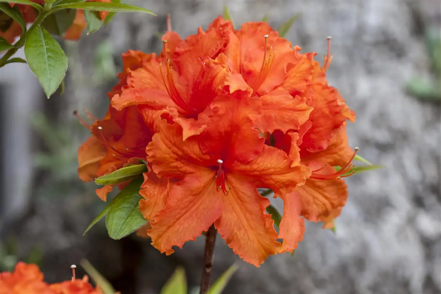 The orange-coloured flowers of the Yellow azalea 'Golden Eagle' appear in umbels from the end of May to mid-June. They are strongly scented.