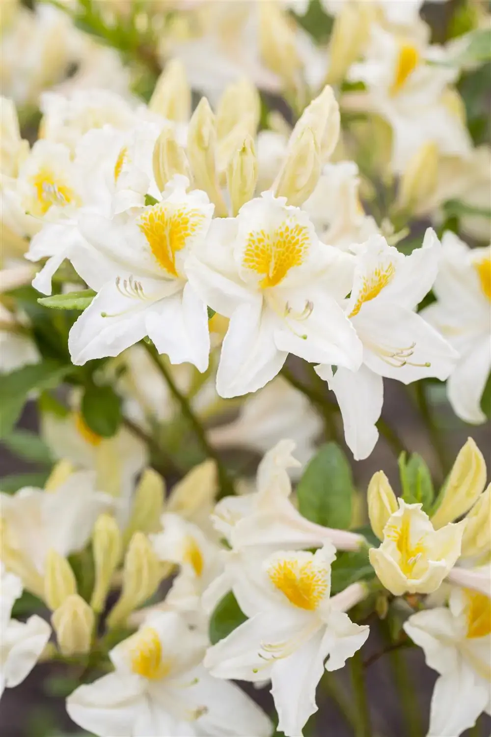 The Yellow azalea 'Persil' (Rhododendron luteum) produces a veritable sea of white flowers with delicate yellow markings from the end of May to mid-June. Its deciduous foliage is a medium green colour. In autumn, the foliage turns dark red. This upright, branching shrub usually reaches a height of 1.3 - 1.7 metres and a width of 1.2 to 1.6 metres. A semi-shady (to shady) location and humus-rich, lime-free soil create ideal conditions for healthy growth. The Yellow azalea 'Persil' is well tolerant of frost.