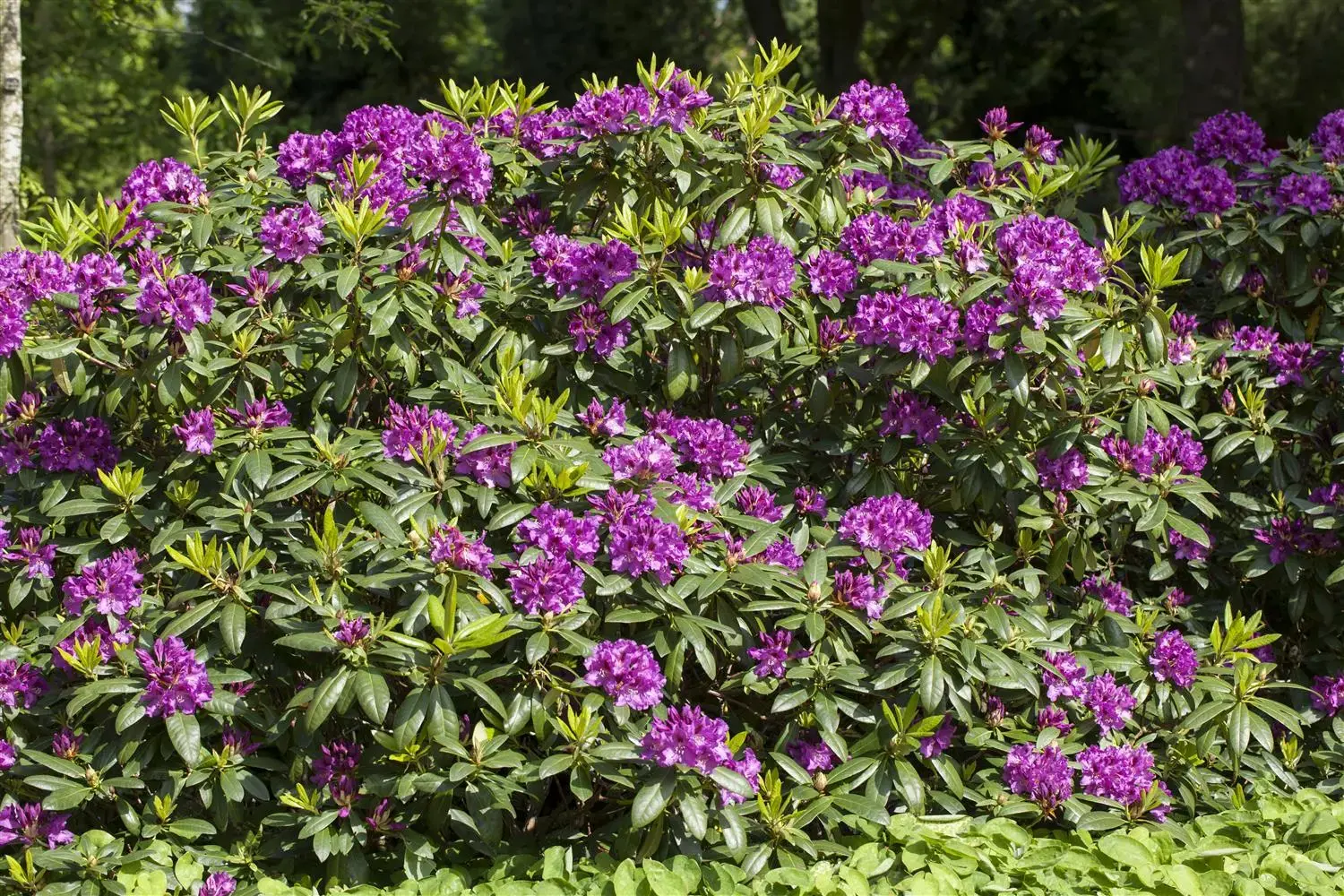 The Rhododendron 'Rasputin' (Rhododendron) produces a veritable sea of purple flowers with black markings from the end of May to mid-June. Its evergreen foliage is dark green. This upright, broad-growing shrub usually reaches a height of 1.5 - 2 metres and a width of 2 to 2.5 metres. A semi-shady (to shady) location and humus-rich, lime-free soil create ideal conditions for healthy growth. The Rhododendron 'Rasputin' is well tolerant of frost.
