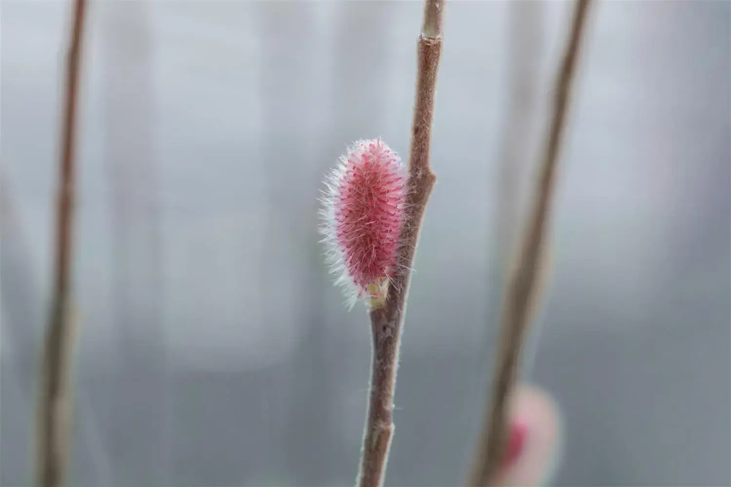 The pink-coloured flowers of the Willow 'Mount Aso' appear in catkins from February to March.