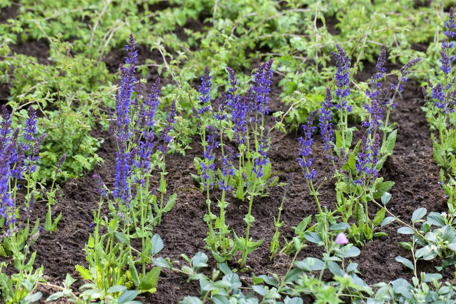 Salvia nemorosa 'Ostfriesland' forms lip-shaped, purple flowers arranged in panicles from June. These grow to around 5 - 10 cm tall. With the right care, re-flowering in September.