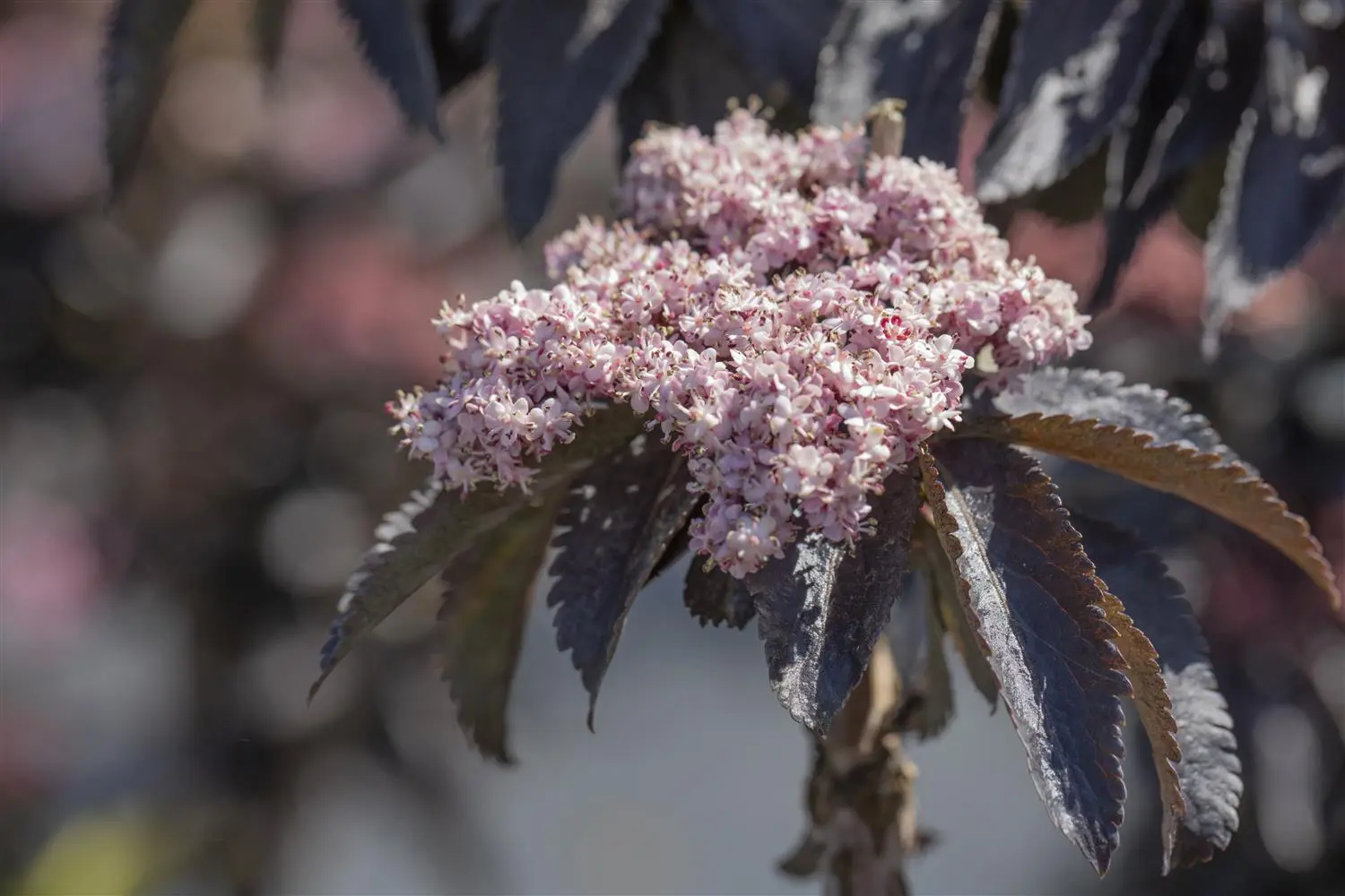 High leaf ornamental value. The deciduous leaves of the Black elder 'Black Tower'®s are black-red, pinnate, glossy, opposite, toothed. Long adherent.