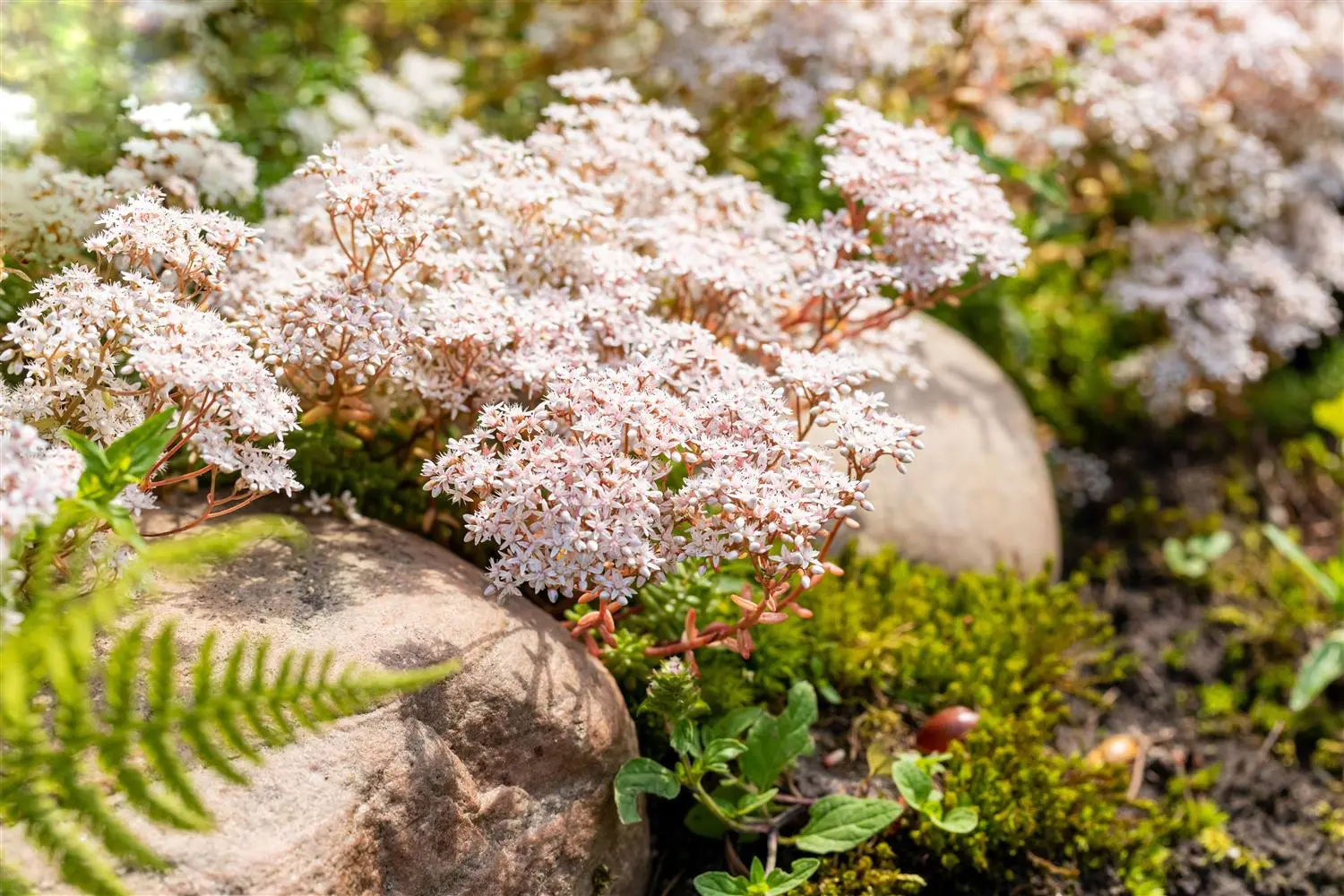 The White stonecrop (Sedum album) is a carpet-like, evergreen perennial that forms white flowers arranged in umbels from May to June. In a sunny, sheltered location with well-drained, nutrient-rich soil, it usually reaches a height of approx. 10 cm and grows to a width of approx. 20 cm. The White stonecrop is well tolerant of frost.