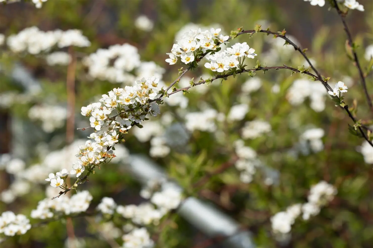 The Spirea 'Grefsheim' (Spiraea x cinerea) is a loose, overhanging shrub that produces white flowers arranged in umbels with a pleasant fragrance. They appear from the end of April to the beginning of May. The Spirea 'Grefsheim' also has lanceolate, medium green leaves. In a sunny to semi-shady location, it usually reaches a height of around 2 metres and grows to around 1.75 metres wide. The Spirea 'Grefsheim' makes no particular demands on the soil.