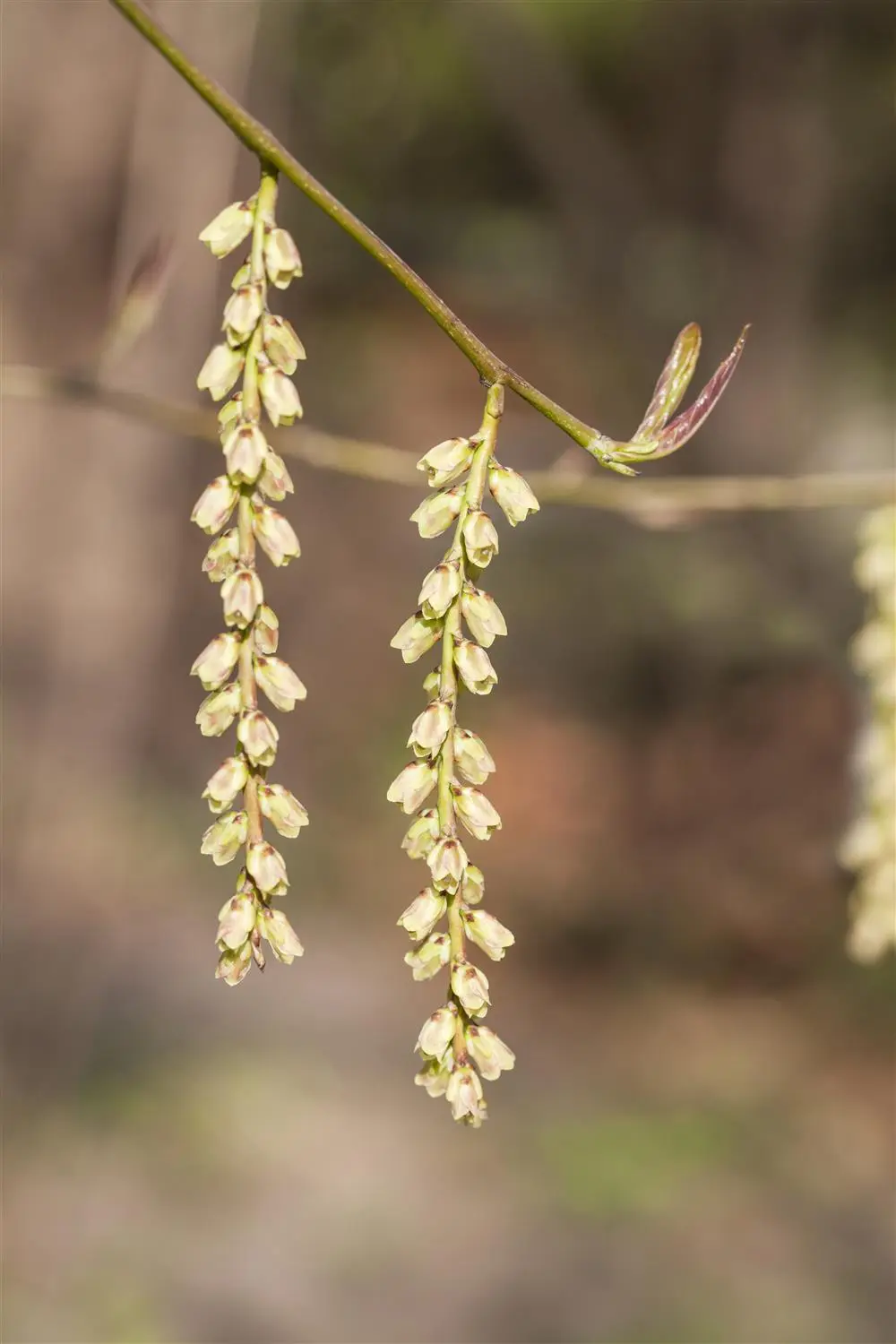 The green-white flowers of Chinese stachyurus appear in spikes from March to April.