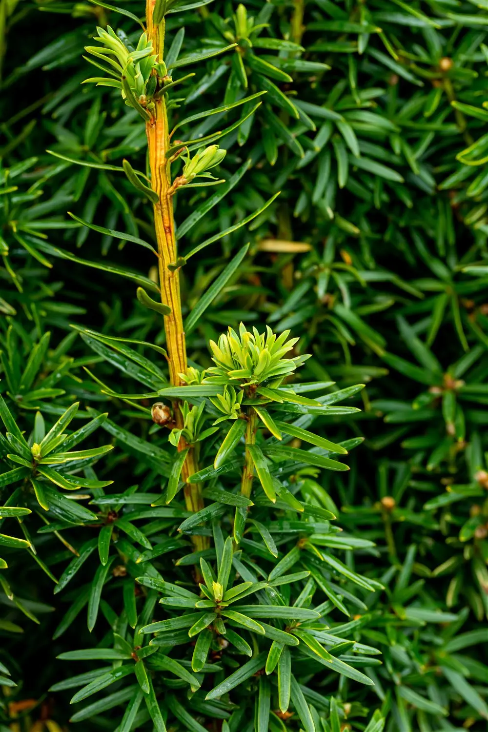 The English yew 'David' (Taxus baccata) is a shrub that grows upright, columnar and usually reaches a height of around 2.5 metres and a width of around 1 metre. Its needle-shaped leaves are yellow-green in colour. Decorative cones adorn Taxus baccata 'David' from September. This shrub is well tolerant of frost and prefers well-drained, calcareous, nutrient-rich soil in a sunny to semi-shady position.