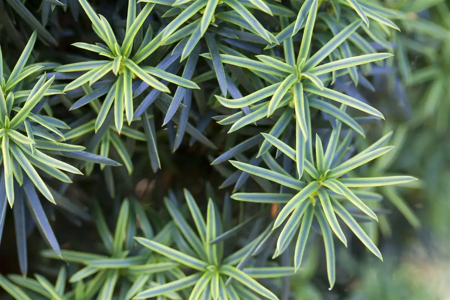 The English yew 'Fastigiata Aureomarginata' (Taxus baccata) is a large shrub that grows columnar and slender and usually reaches a height of around 5 metres and a width of around 2.5 metres. Its needle-shaped leaves have a medium green colour. Decorative red cones adorn Taxus baccata 'Fastigiata Aureomarginata' from September. This shrub is well tolerant of frost and prefers well-drained, calcareous, nutrient-rich soil in a sunny to semi-shady position.